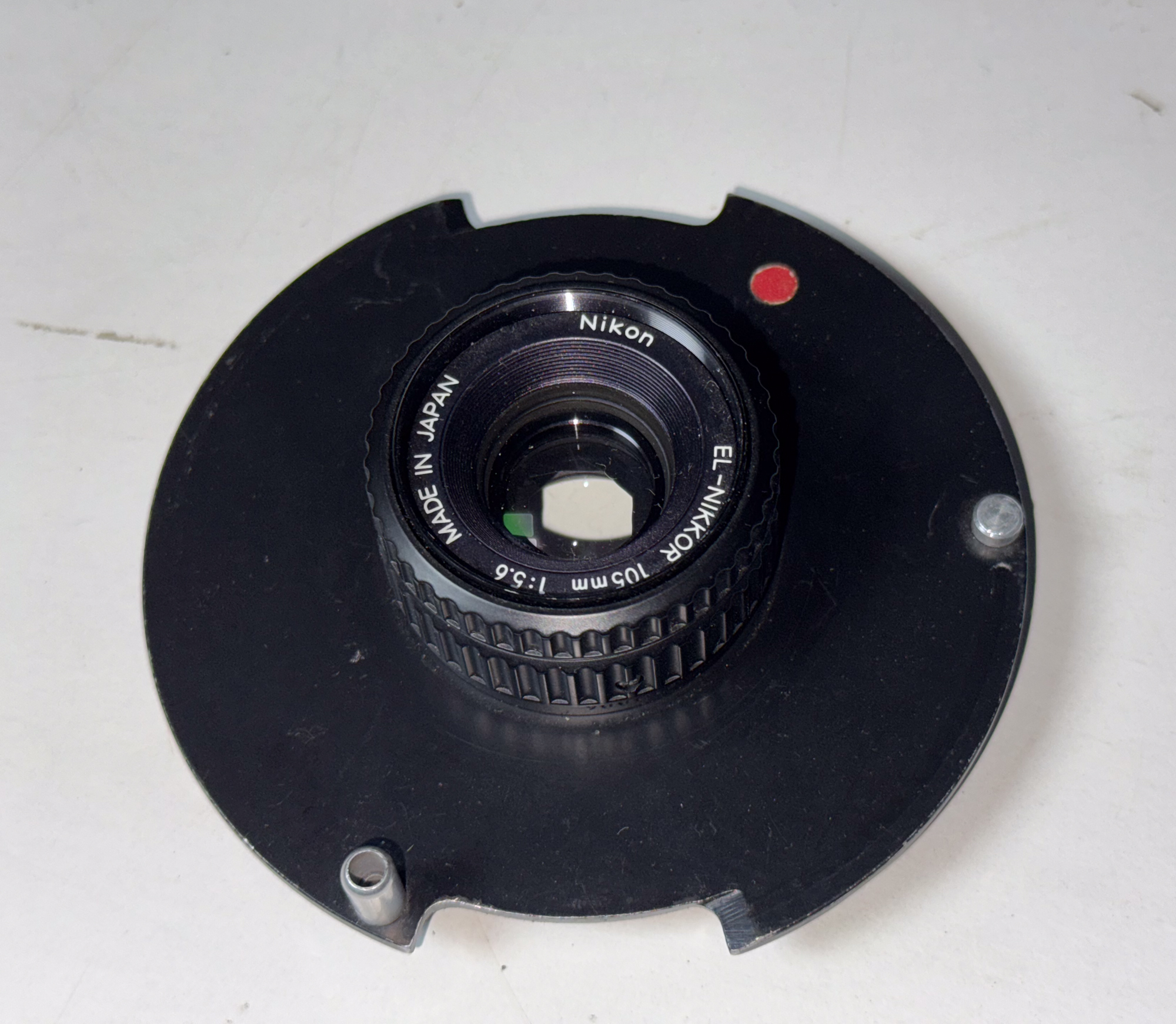 Comes with one 105mm EL-Nikkor mounted and one spare 39mm non-threaded, recessed lens board.