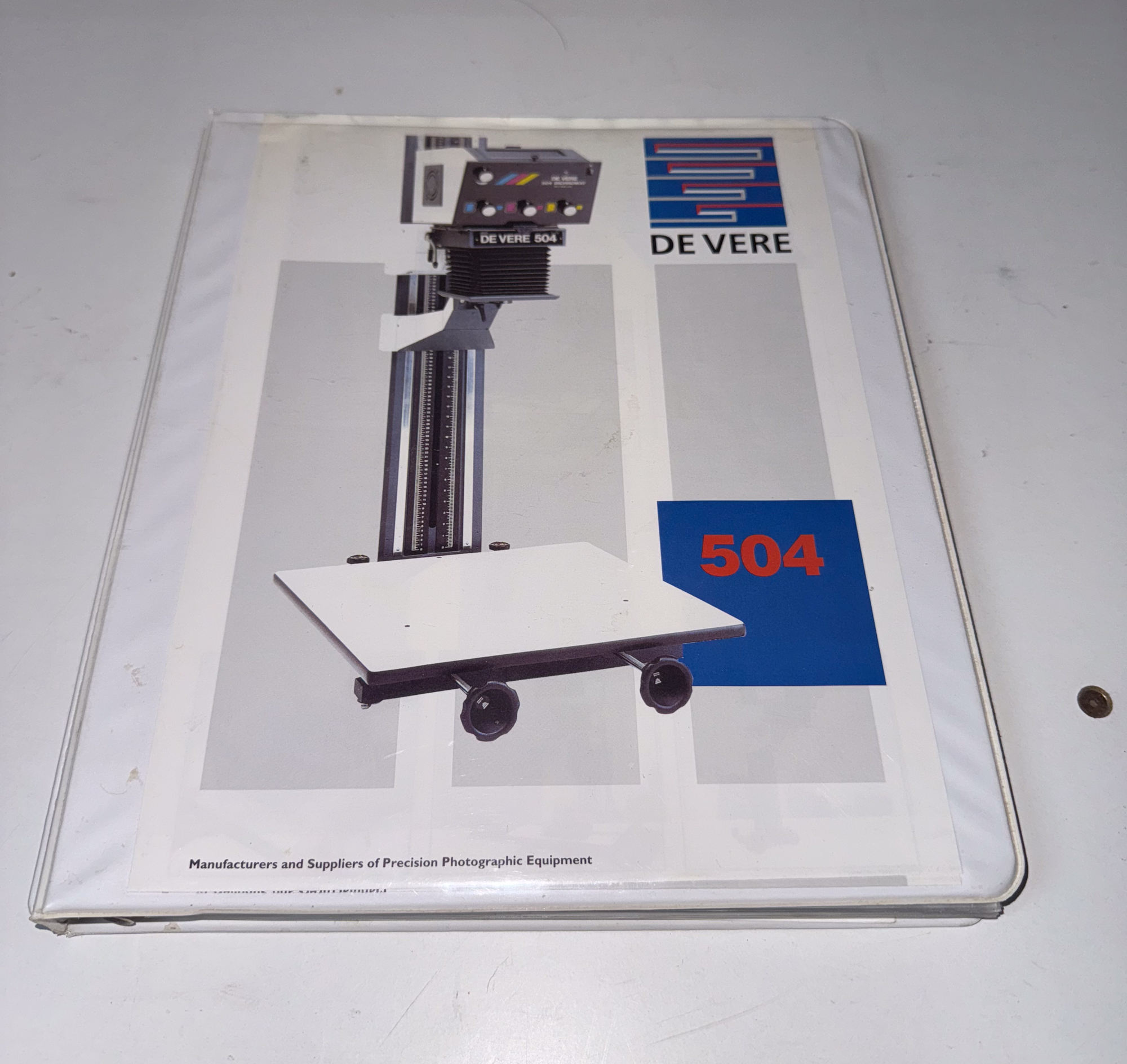Thick manual that covers not only the 504 but also the 5108. Part numbers, lens board selection guide, enlarger setup. This contains both original and photocopied pages.