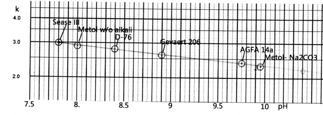 According to "The Theory of the Photographic Process", Third edition), the temperature dependence of the rate of development can be expressed roughly in terms of a coefficient, called k, which is the ratio of the rate at a particular temperature to the rate at a temperature ten degrees higher on the Kelvin scale or 18 degrees higher on the Fahrenheit scale. Among the factors affecting k is pH. It was not noted in the reference, but a plot of log(k) vs pH is for practical purposes a straight line between pH values of 7.8 and 10 and values of log(k) from .477 to .362. This region of linearity includes various compositions of Metol, Metol and hydroquinone, and catechol.