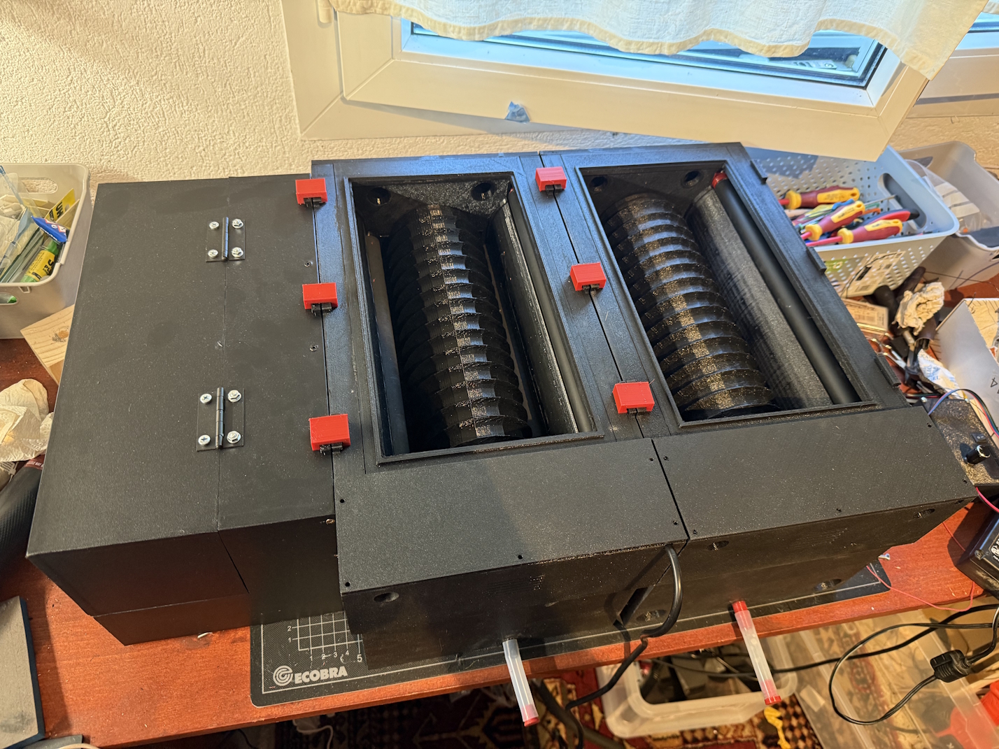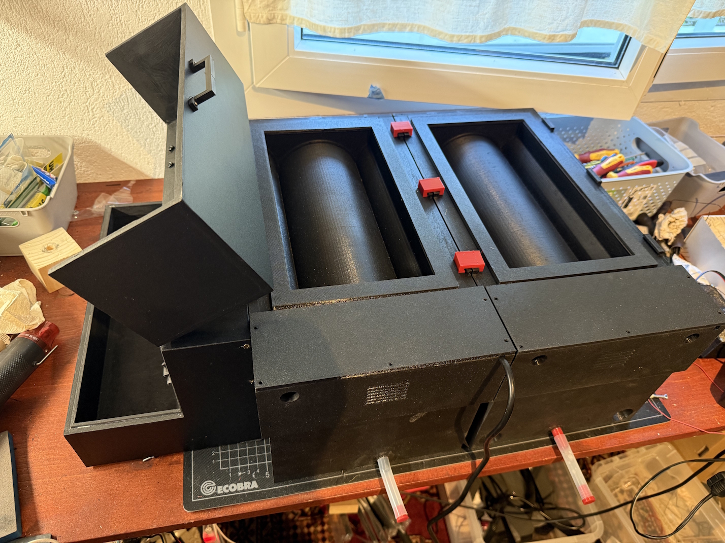 Initially, I designed three PETG 3D-printed versions. Since this part doesn’t come into contact with chemistry, I even considered PLA. But at some point I thought – why 3D print everything? It's mostly flat walls and a light-tight flap.