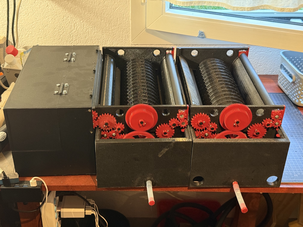 Two hinges later – and it’s done! The only technical issue remaining is gear meshing: the 21-tooth drive gear barely grips the intro roller gear. I’ll likely shift the axle by about 0.5–0.7 mm to improve engagement. For now, I'm using slightly oversized gear teeth as a workaround. As always, some tolerances only show up in the real-world build – no matter how accurate the CAD model.
