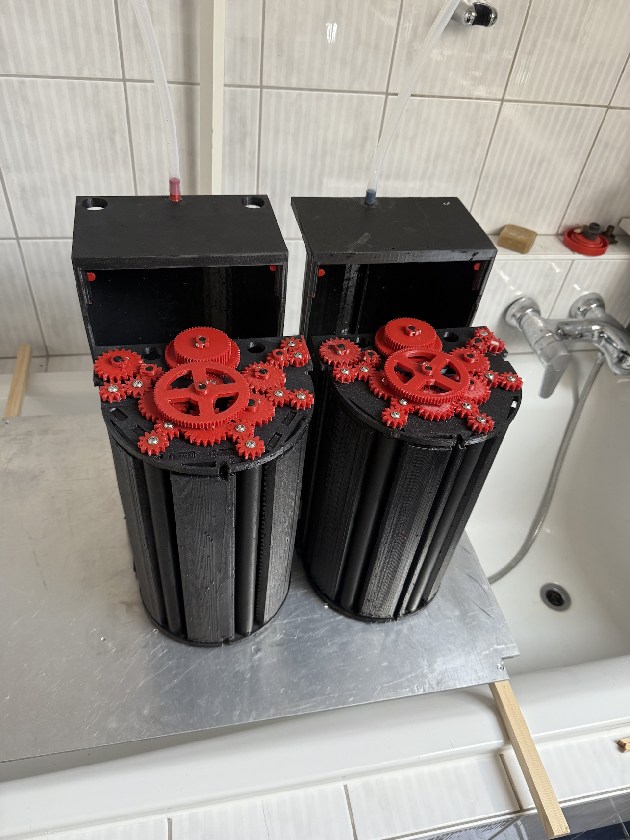 At the moment I still have a “hybrid” setup with some old elements, the new RA resistant transport rollers, the guides with displacement and a few other details for fixing the gears. But everything shoould be RA compatible now. The original exit rollers are still with aluminum axles, but they are over the liquid level and I have coated them with epoxy. This version is a kind of version 1.1 which will probably be applicable for RA4 tests. Based on my findings, I am drawing a new version (2.0) that has all the new features. This will then be set up for a second module so that I can slowly move towards the RA4 test. In between is the construction of the light-tight housing and cover. And of course the entry module.