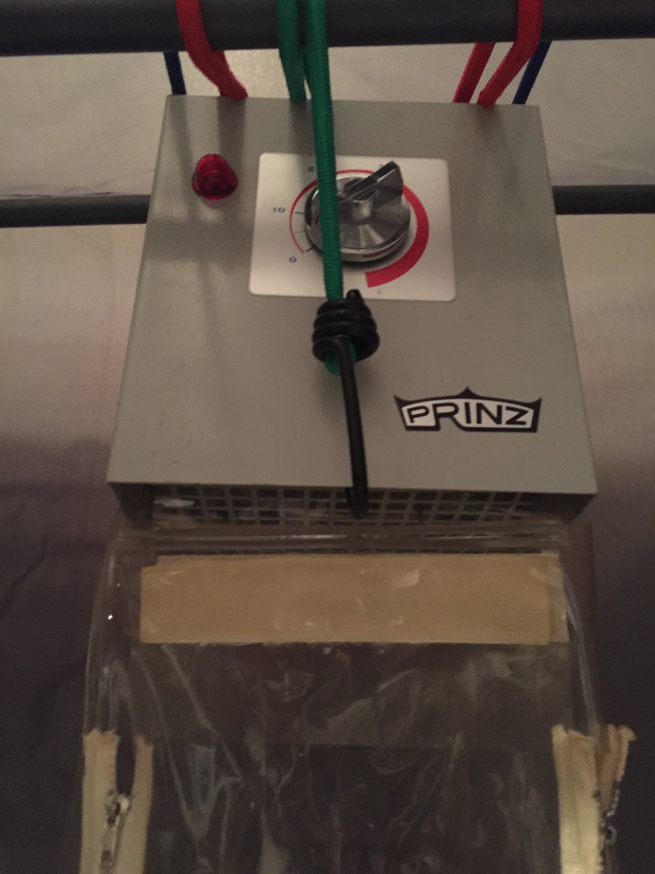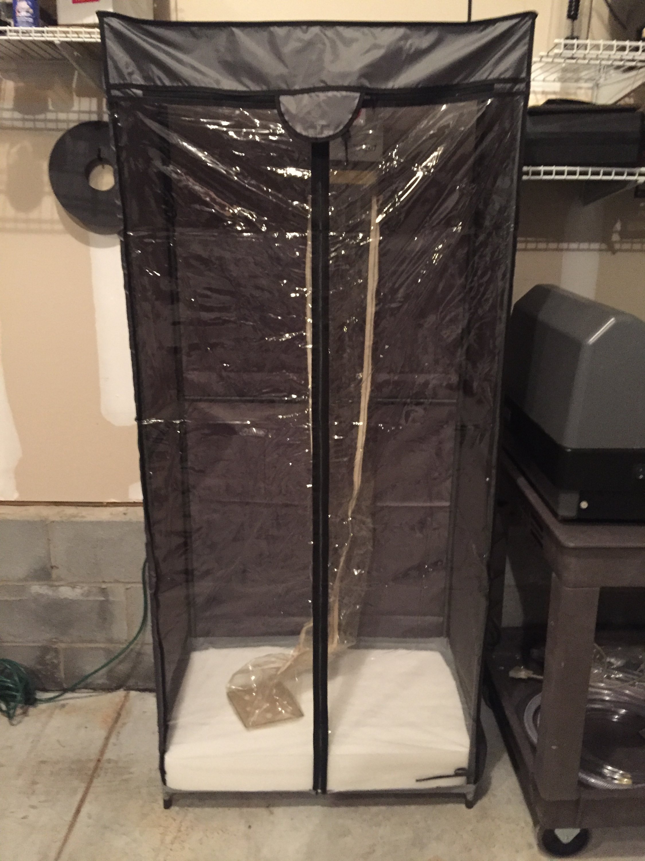 I built the picture setup quite easily. I picked up this relatively inexpensive clothes closet from Home Depot. I liked the vinyl cover that is well sealed all around except for the base and clear zippered door and rod. I added a 5-inch block of foam to the floor of the portable closet and sealed it on the exterior and interior with wide gaffers cloth tape to the vinyl so that no dust can get in from the bottom. I then picked up a used filtered Ptrinz film dryer head for about $15 on eBay – these are virtually identical to the more expensive used Jobo Mistral dryer heads and usually sell for a fraction of the Jobo – same filtering, same timer etc. The one I bought has the clear bag attached that I didn’t need, but I left it attached and now have twice the dust protection. Even though I’m not using the full length of the dryer bag I don’t need it as I’m doing medium format and 4x5, not long 35mm rolls which might also fit.