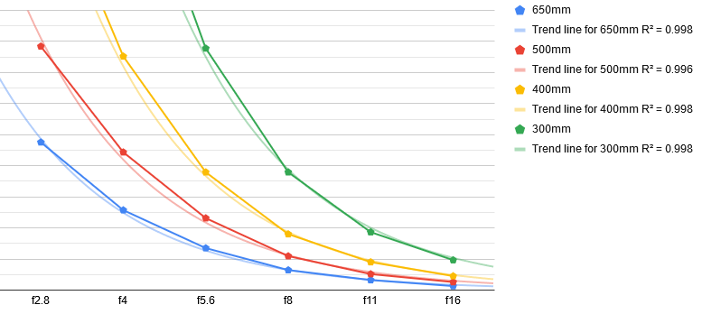I measured aperture change in lux on different column heights. I used clear developed acetate so I didn't need to focus the image + find the same spot from the negative. So these values are close to dmax, I guess?