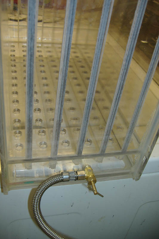 The actual material used was 1/4" thick polycarbonate (trade name Lexan). I used a table saw with a fine tooth blade to cut grooves for permanent joints and for sliding the separator pieces in and out. All the joints are held together using industrial RTV Silicone. The holes were drilled with a drill press but I think a hand drill would work just as well. Having said that, I really don't think you need to go that far. Your washer can be re-piped so that dividers can be added and each section gets its own flow. You are already so close. Besides, if it's already doing a good job it would be more fun to spend the time printing.