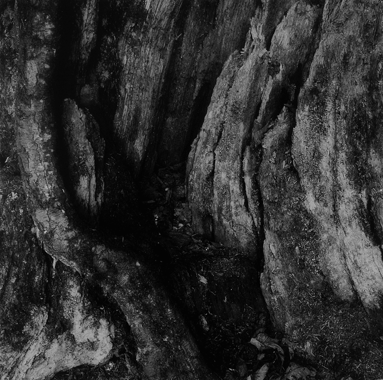 In the cleft itself, but not in the shadow of the stump, pointing back at the camera.