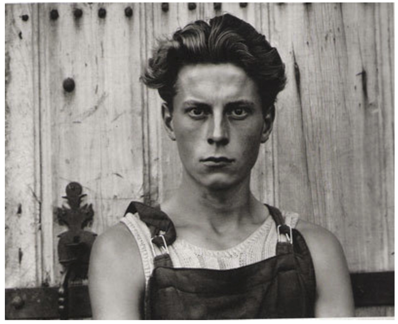He has nice well kept hair, vulnerabilities around his mouth, a cold stare like he's not going to give into you without a fight. It looks to be taken around the 30's, but I've seen similar look from young men who have done it tough at different time periods.