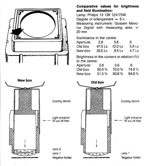 @Pstake: Thanks for the info. I checked and I already have the new version of the light mixing box. As I understood the Kienzle modification replaces the opal glass condensor with clear ones, thereby converting the V35 in a condenser style enlarger. But I might have misread the description in the catalog.