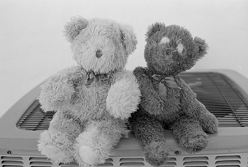 The shot of the two bears and the gas meter seem to be right on for 8 minutes with that flat lighting but too much for contrasty situations. It's difficult to use a "one time for all" on a roll of film with different lighting conditions. Still, not too bad for an unknown film for a first time development.