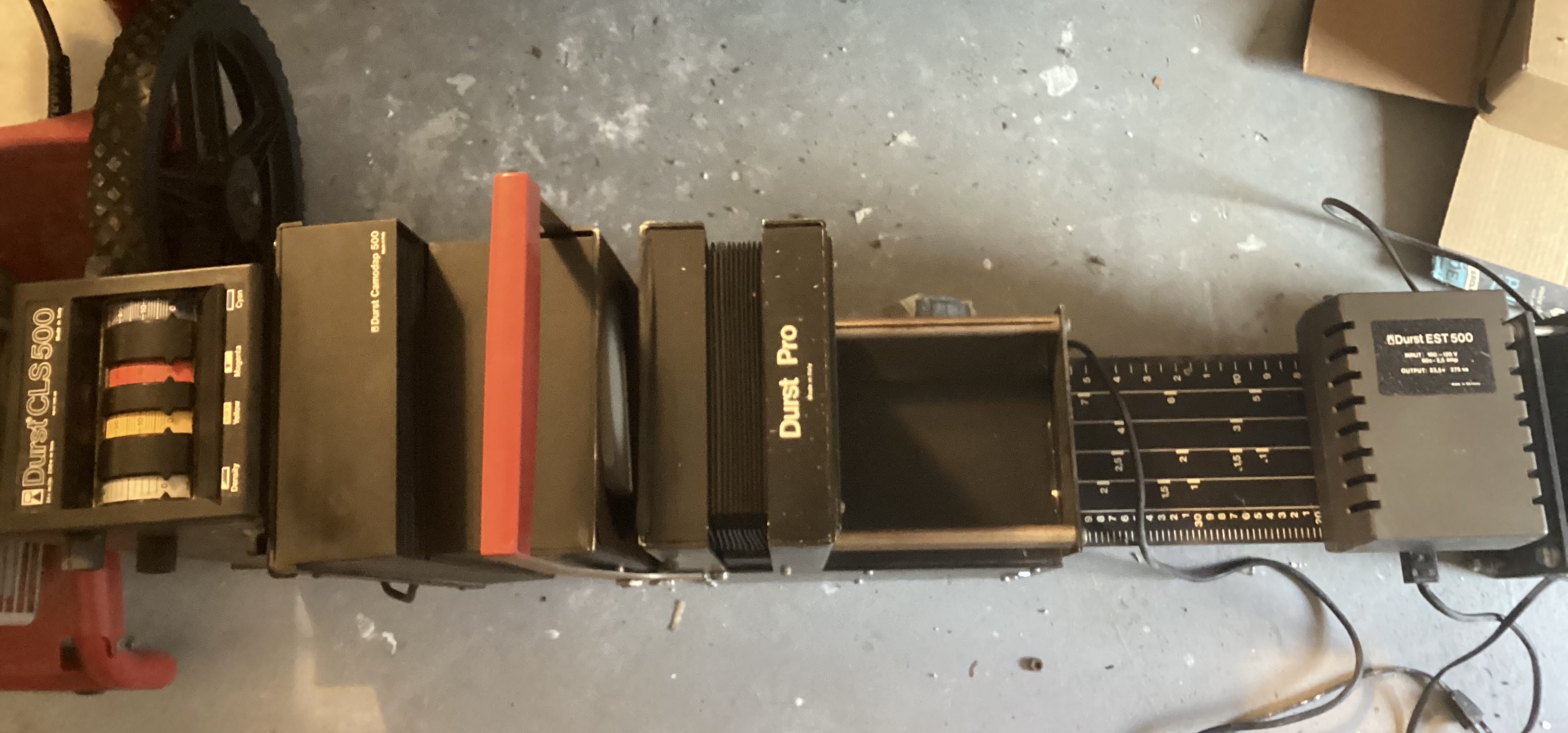 First up is a Durst 4x5 enlarger; I can’t remember what model it is now but it has a CLS 500 color head. It does not have the original baseboard rather a custom oversized one; when I say custom I mean big a.. piece of plywood.