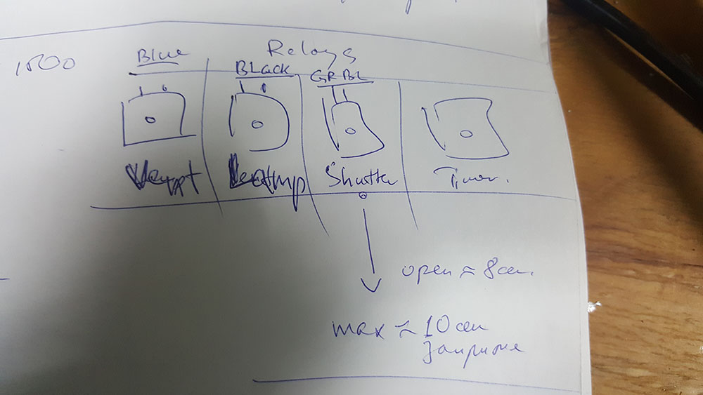 As I think logic looks like: we trigger 10 sec EXP from the timer. Last start to glow. In 3-4 seconds shutter is started (depending from 1st relay delay). In 10 seconds timer ends and 220v is removed from 1st relay. 24 volts are removed from 2-3-4.