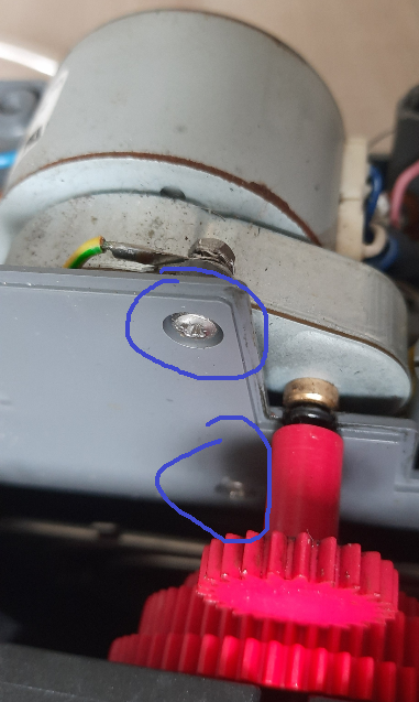 If these can't be fastened, or there's still play on the red gear after fastening them, open up the motor / temp control unit and inspect for damage to the plastic. Sadly, the plastic of the Printo machines doesn't stand the test of time very well and becomes a bit brittle.