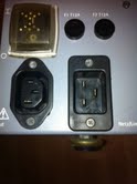 The power cables are IEC. The male one is 15A, the female 10A. Again, readily available at good electronics stores - just take them your photo in a larger size and they will find you the right plugs.