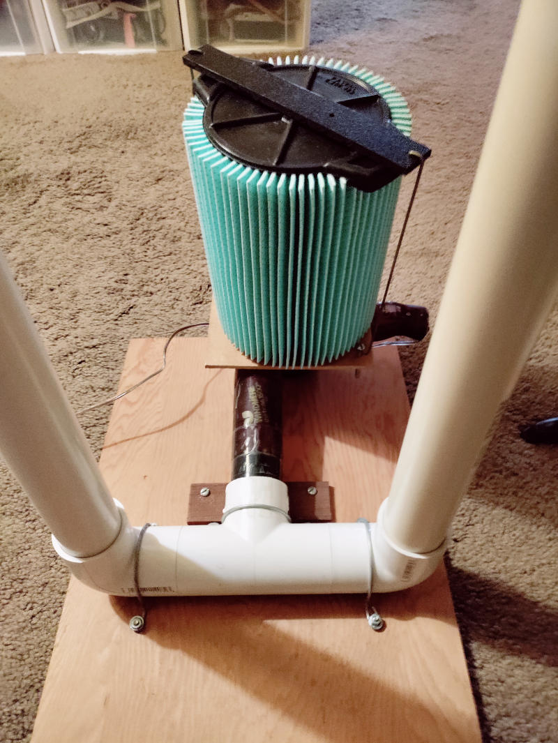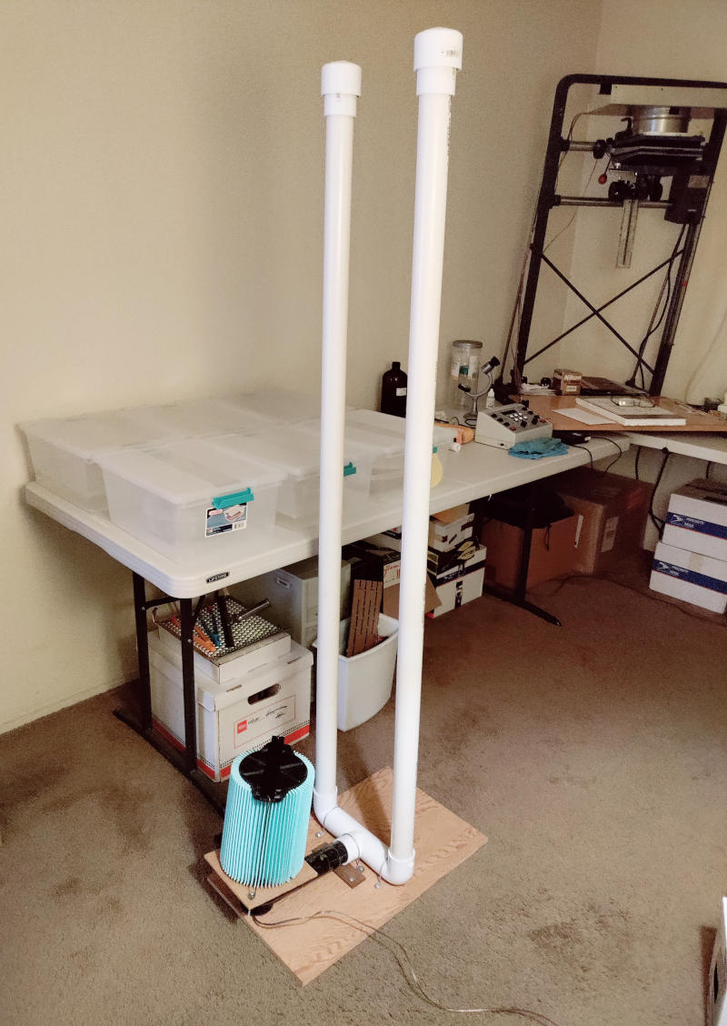 That large HEPA-filter is overkill, but it's what Home Depot had in stock, and I didn't think of buying a smaller one online. The long vertical pipes are not glued to the bottom, they are held by friction, so they can easily be removed for transport or storage. I removed the heater from the hair dryer, and run its motor using a 5v or 12v DC power-supply, so it provides a gentle breeze up the pipes. Humidity here is about 50%, and film dries in 30-45 minutes.