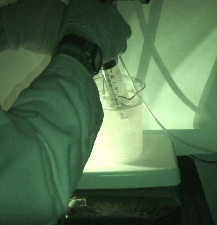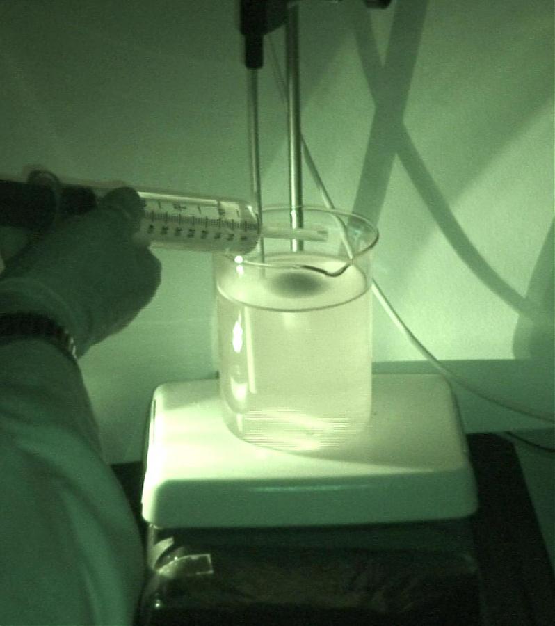 The first picture shows the syringe posed over the beaker before precipitation starts and the second shows the precipitation in progress. Hopefully you will see the white cloud of emulsion being formed in the beaker.