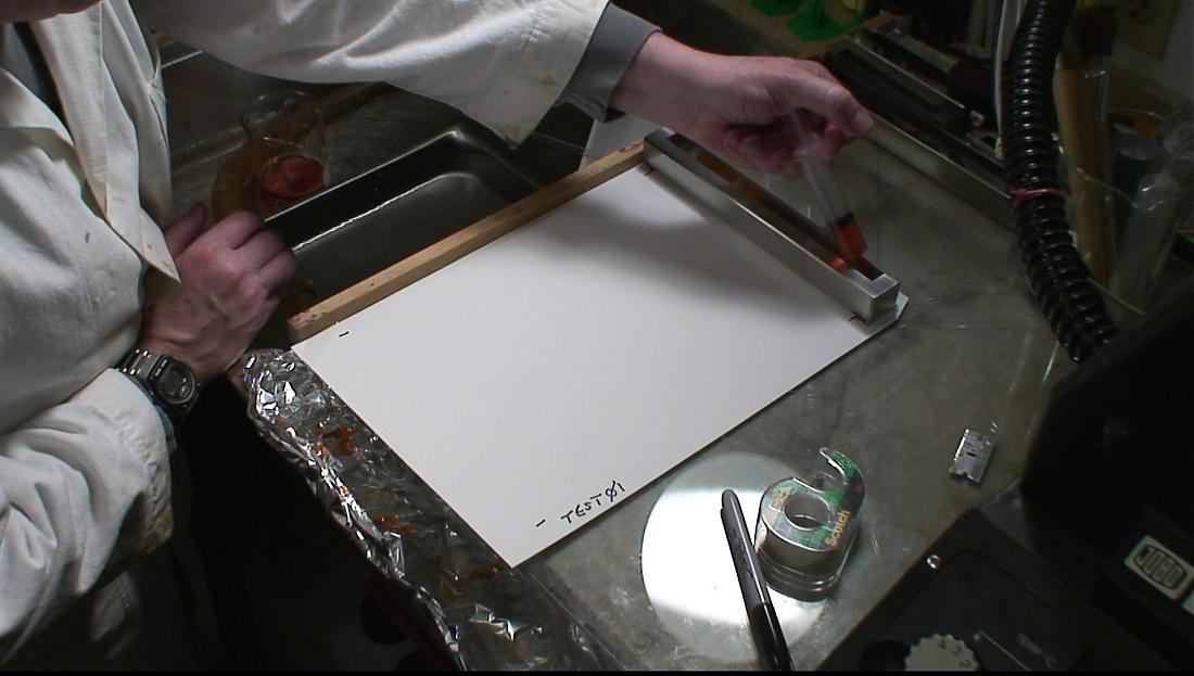The first picture shows the blade being charged with 12 ml of "emulsion", and the second one shows the action of drawing the blade across the paper to create a finished 8x10 coating. Defects are to be expected at the top and bottom of the 'run'. In fact, coating defects of this nature occur even with a full production coating machine due to starup and shutdown.