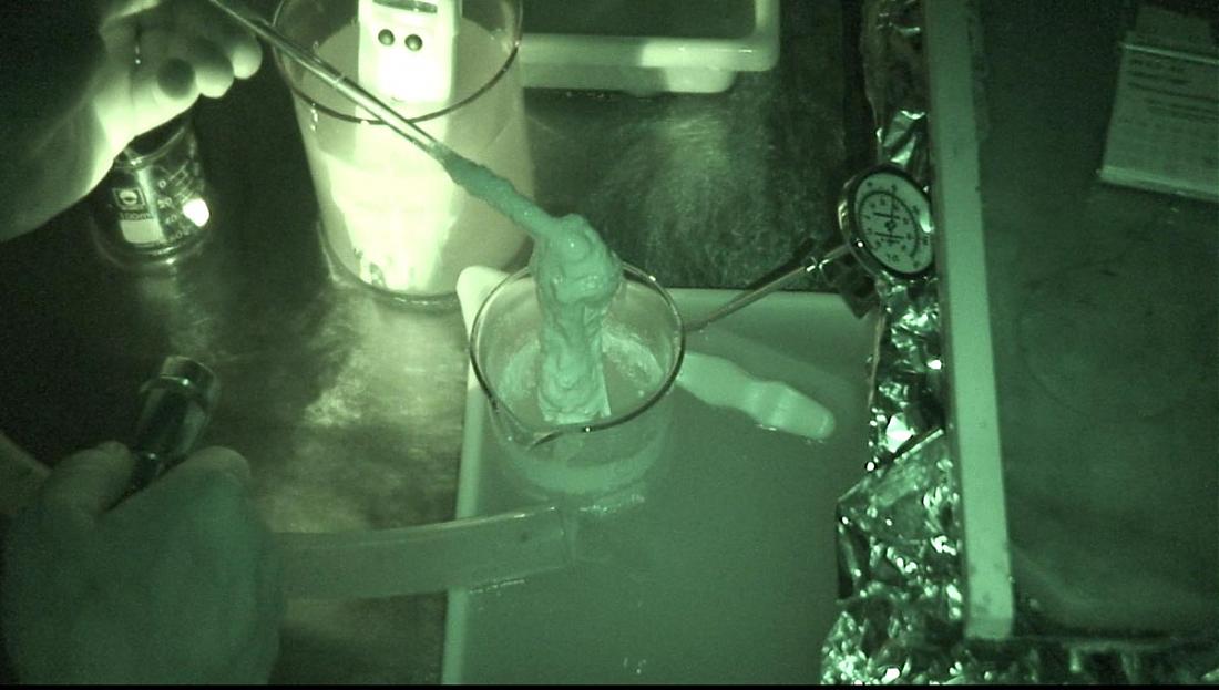 Here are two still frames taken during a practice session for the DVD. I am using 10% gelatin, tinted with food dyes for visibility.