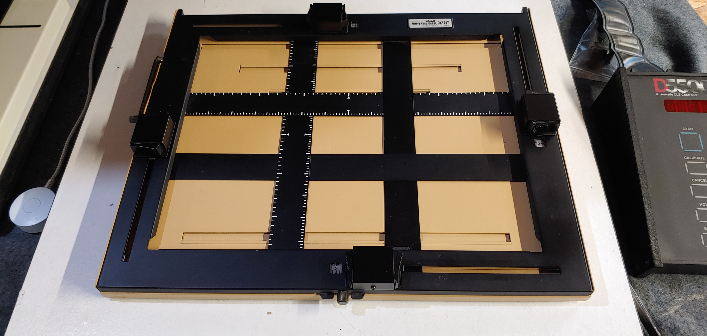 20x24 paper in a Saunders 16x20 easel. You made me go look and I was off a bit. The 2 rear stops are magnets with 3/32 inch square brass tube glued to them. They keep the magnets from slipping down and center the paper front to back. They are movable to avoid the blades. The left stop is a piece of 1/8 inch square Keystock also to center so the blade scales are accurate. Photos from the dark side Z7ii available light in the darkroom. lol