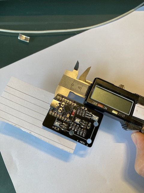 I attached the PCB to one jaw, a card with a slit to the other. Measured the slit with the calipers (before attaching!) and then moved the slit until it triggered a sensor and measured again until the sensor wasn't triggered. The measured width was approximately 1mm wider than the actual width.