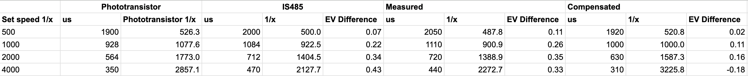 So the summary from this is that, uncompensated, the IS485 sensor is around 1/3 stop away from the actual measurement at higher speeds, but that when I apply the compensation algorithm this reduces to under 1/5 stop. Again, some of this variation might be caused by two separate shots having slightly different actual times since there will always be some variation in a mechanical camera.
