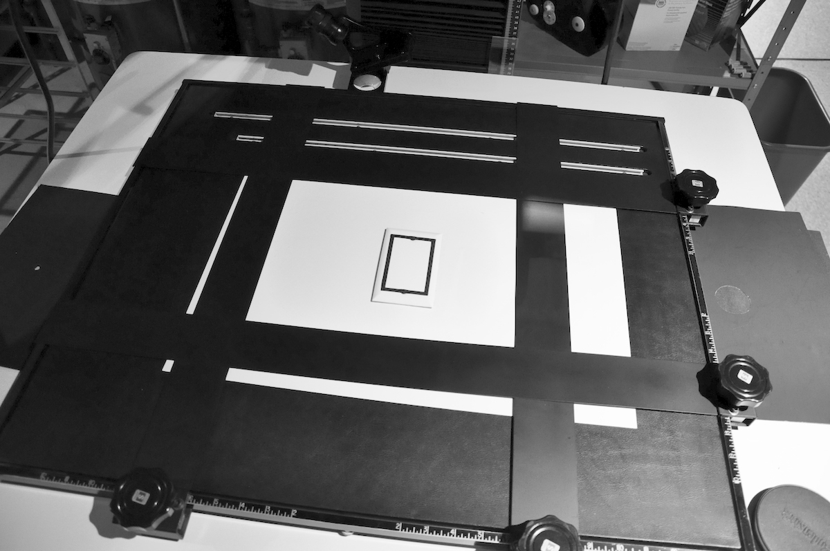 Draw regularly spaced lines as shown above. I taped on a thin strip of white paper with lines so they would be easier to see in safelight. The diagonal sheet of paper is an example of a test-strip consisting of a 4x5 cut in half -- a size I often use when making 4x5 prints.