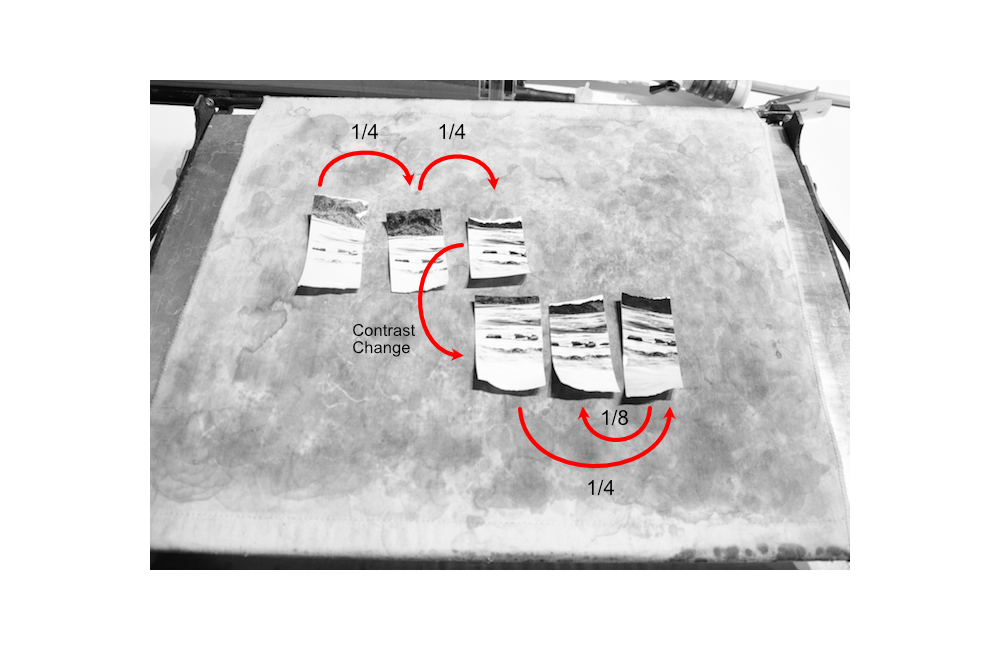 For example, every step above contains the foreground hill, trees and sky. But such a localized test-strip is hard to make because you must move the strip after each exposure and mask everything outside that exposure.
