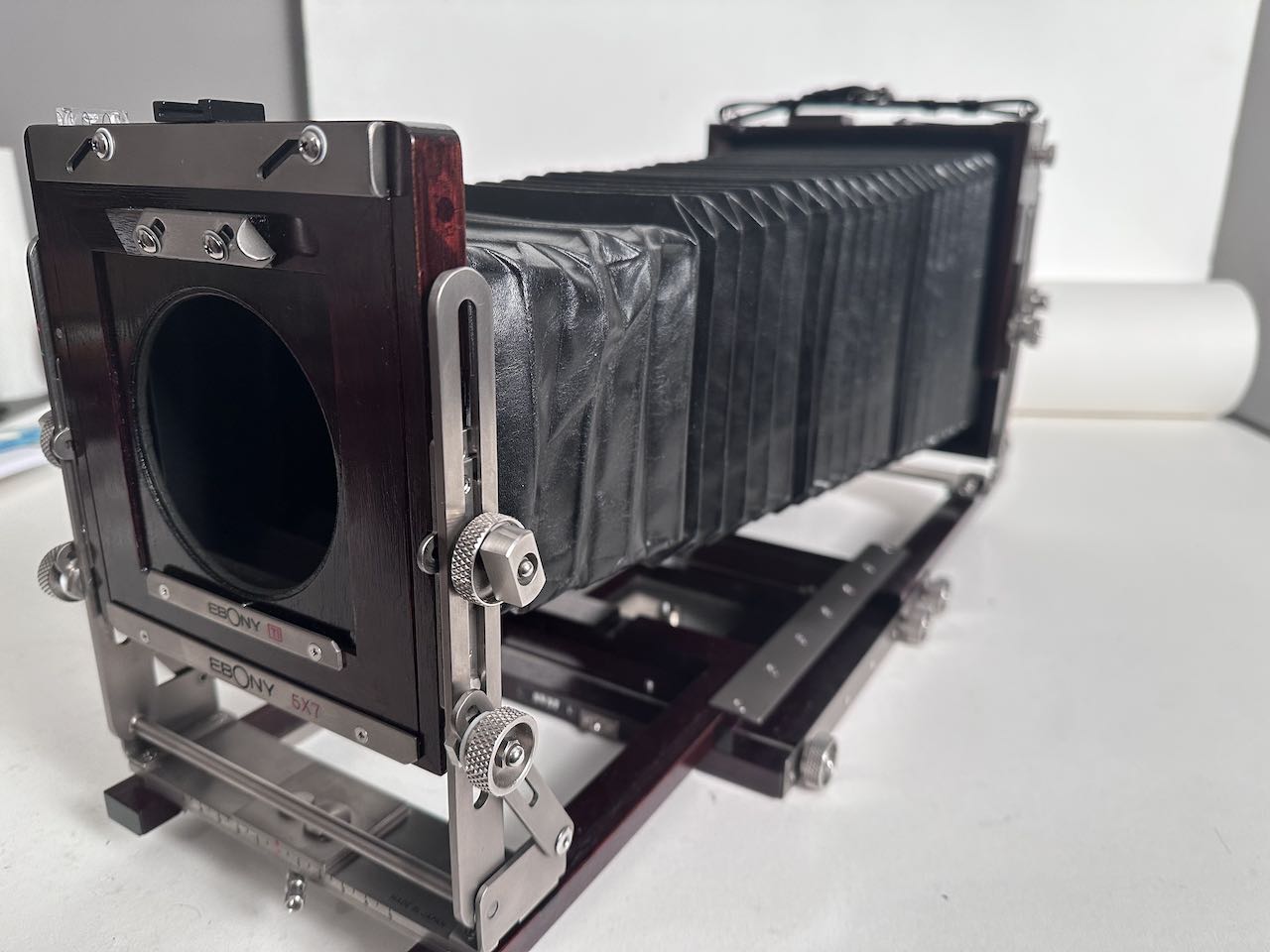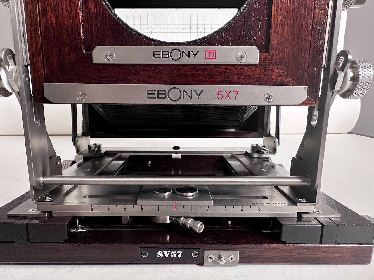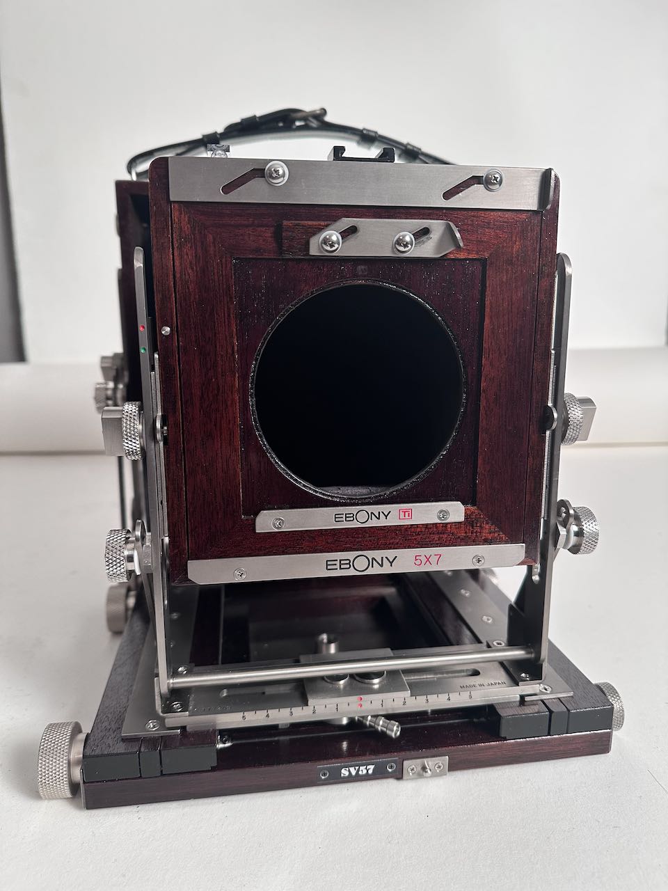 Selling my Ebony SV57. One of the latest produced before Ebony ceased production. The camera is in excellent, mint condition, only a couple of screws show signs of use. Included is an Ebony Sinar to Linhof adapter and an extra standard bellows. Both bellows are supple and light tight. The ground glass is very clean, with protector. Ebony box.