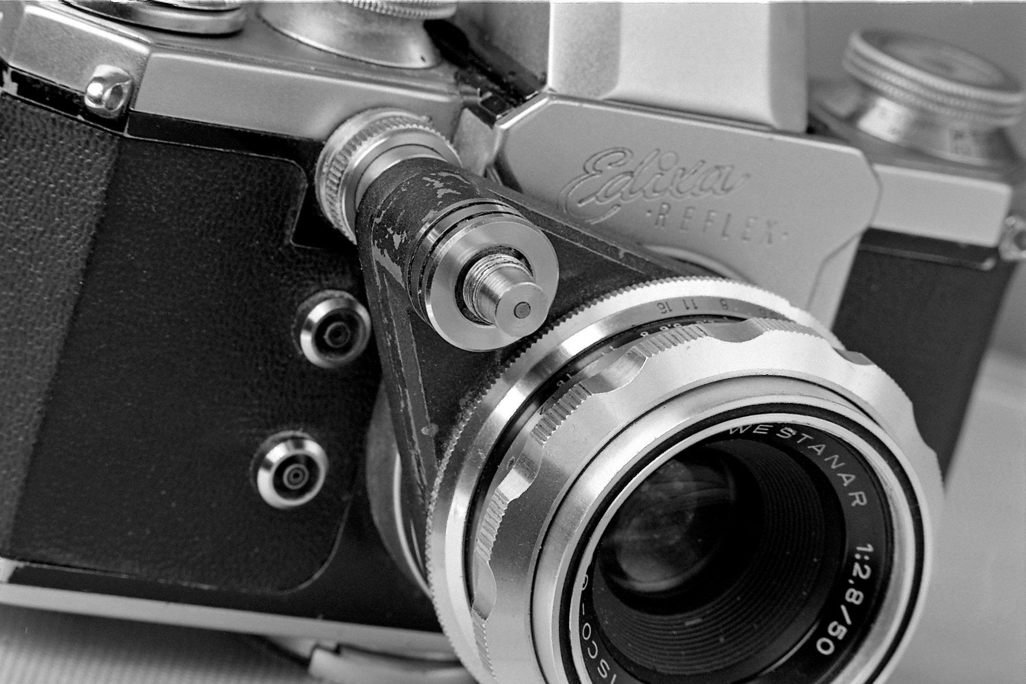 This is not a popular camera, and I'm having trouble finding much about its internals. This is the original Edixa model with no instant-return mirror or stop-down mechanism in the camera. It all works, except at the slow speeds, 1/25 or less, as well as B, the second curtain does not want to close all the way. Unfortunately, 1/25s is the sync speed, so I can't use flash with the camera or do time exposure still lifes without these slow speeds. The camera has a shutter speed dial that rotates when the shutter is released, like that of the Russian Zenits. On a Zenit which had the same problem, I was able to easily fix the problem by tightening the tensioning screw for the second curtain. Unlike the Zenits, there is not an obvious accessible tensioning screw for the second curtain visible when the bottom plate is removed. I'm not all that dextrous, so removal of bottom plate or dials on the top is all I risk trying. I'm not going to go in through the front on an otherwise working camera. I tried squirting lighter fluid in from the top and bottom and dabbing some lithium grease here and there, which didn't help too much. Any advice?