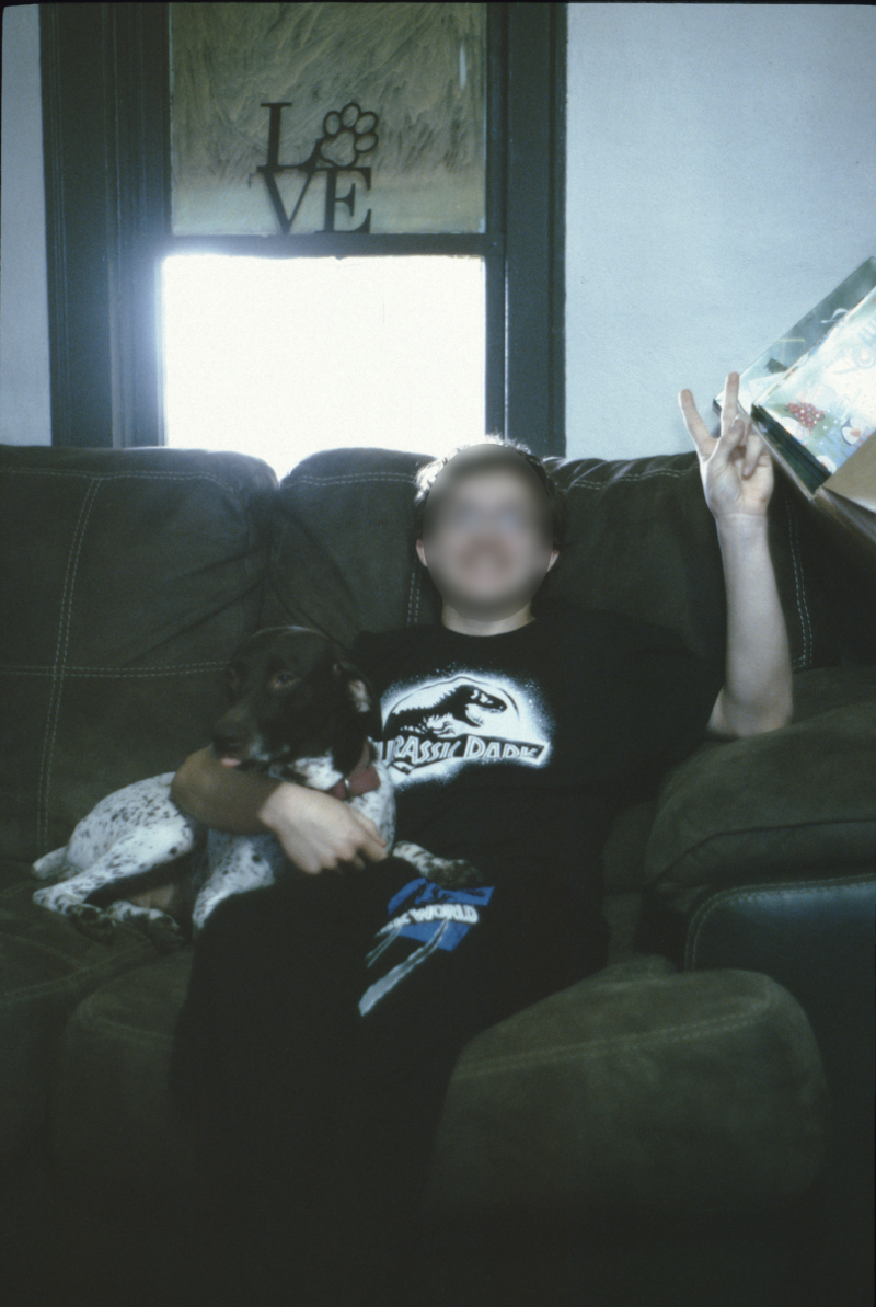 The photos were lit as follows: The first photo above was shot using electronic flash, as the available light was likely 2700 K lighting (tungsten-balanced for sure). The second photo was backlit by daylight, but supplemented with the aforementioned 5000 K LED lights. I exposed for the foreground and let the light coming in the window wash out. The third photo was at night, and only lit by the 5000 K LED lights. Colors are shifted blue, at least in the highlights (like the dog's fur in the 2nd and 3rd photos) in all 3 photos. The couch is actually brown, but it looks a bit blue-shifted here. A light warming filter would likely help with this, but I'd lose a little speed. I'd do that if I only lost 1/3 stop, which would mean I'd be exposing at EI 640. If I were planning to shoot under electronic flash, I might only do a 1 or 2 stop push and shoot at EI 200 or 400. Then again, I might just do EI 800 again,since I've got another roll started at EI 800 in the camera already.