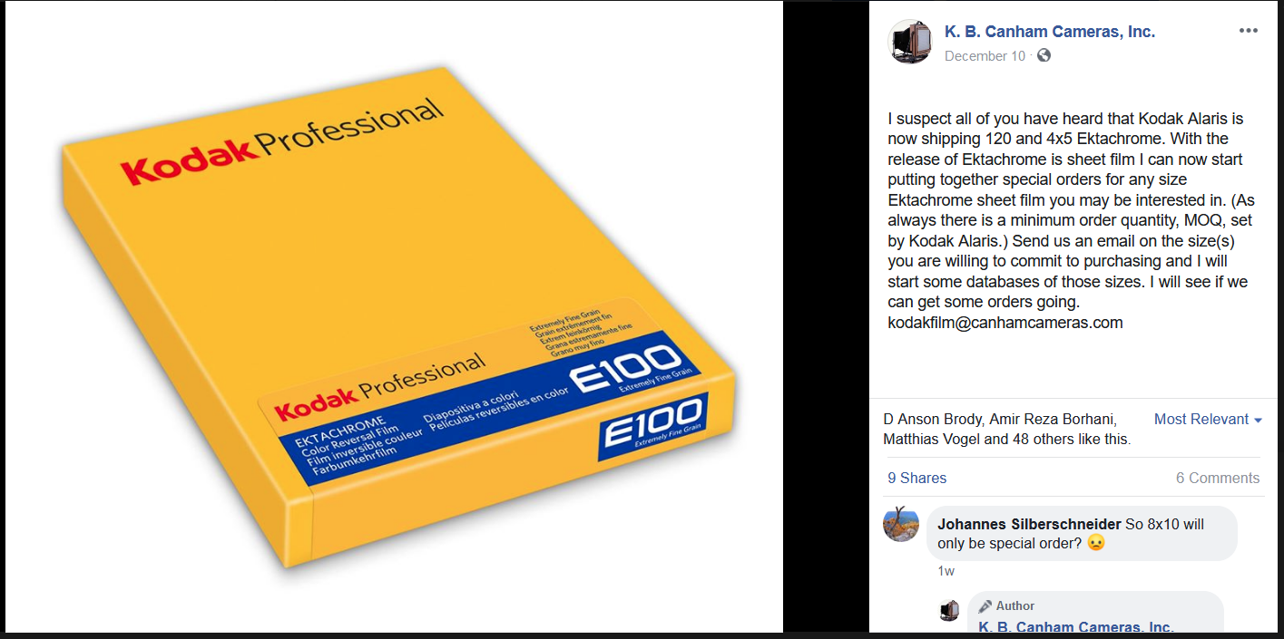 I'm waiting for my 35mm test roll to come back before ordering any 4x5. I sold off all my 8x10 chrome film a couple years ago due to having switched to Ektar color neg. But if the neutrality of this new Ektachrome is good enough, I might consider it in 8X10 again. Polyester base is essential to my printing needs, because acetate is not dimensionally stable and won't stay in register with masks. Ektar is great, but there are certain lighting situations it struggles with. And I love the way you instantly know what you've got when you slap a chrome atop a lightbox.