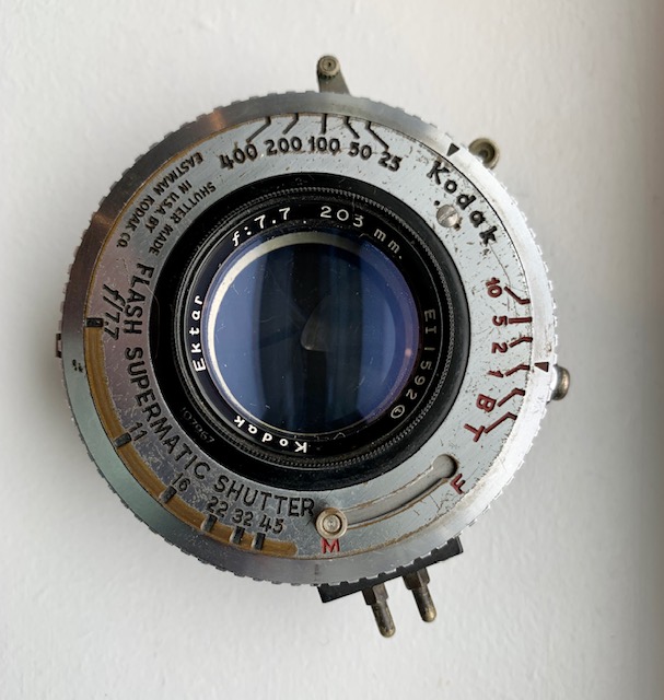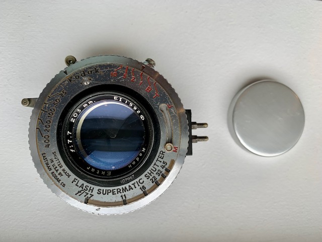 203mm f7.7 Kodak EKTAR in a Flash Supermatic shutter. Glass is in good condition with a few cleaning wisps and the usual dust specks. No fungus and maybe a hint of haze. Shutter front plate is a bit worn but is clear enough to see speeds and aperture markings. Speed selector is a tad stiff but turns smoothly with a firm grip. Shutter fires on all speeds including T and B and from photos I have taken probably a half stop slow. Button that opens shutter for composing and focusing works as it supposed to. Aperture lever missing the little click stop piece but works fine and opens and closes smoothly and aperture and shutter blades are oil free. Comes with front cap and flange. A classic lens that covers 5 x 7 and a google search will provide lots of information.
