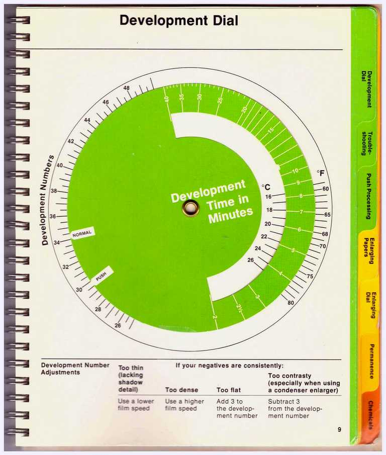 There are some extra tables with numbers to add to the index to adjust time (basically, adjust contrast) for condenser / diffusion enlargers, paper grades, and so on, but I mostly use it for the time/temp adjustment.