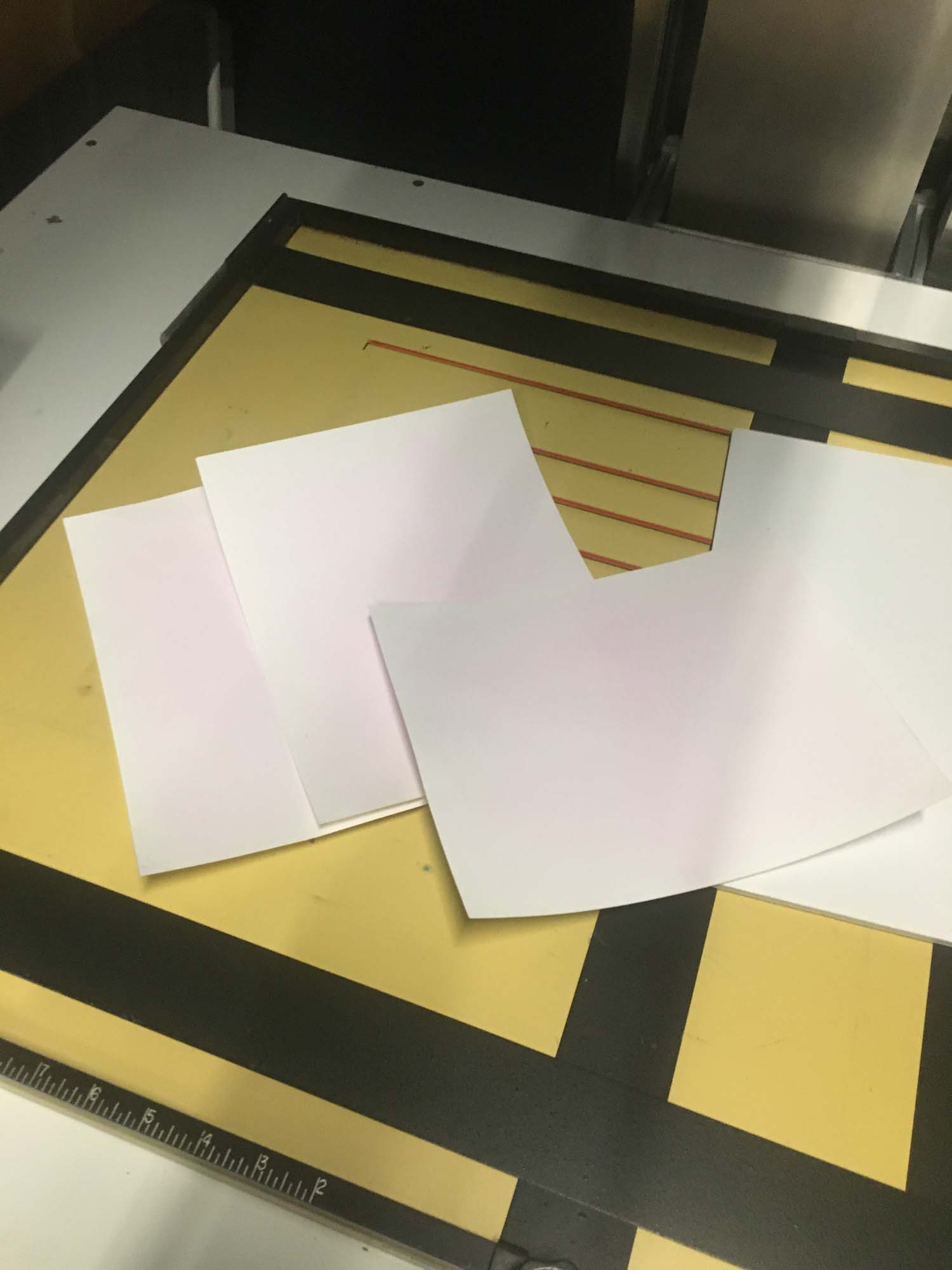 The first thing I did for this was to replace the sodium chloride salt usually used for salt prints out for ammonium bromide. From what I've read, silver bromides have a higher sensitivity range than silver chlorides, so using ammonium bromide increases the sensitivity of the paper to around 425nm, just within the visible range. To make it faster, I first looked into using steigmann's solution, which contains very small amounts of sodium thiosulfate and gold chloride which adds defects to the silver halides making them more reactive. Steigmann's solution must be heated to around 55c to activate though, and I couldn't figure out a good way of doing that. I did try using a heat press, but mine turns on at more than 55c, and it seemed to fog the paper. Talking with Jonathan though, he recommended I look into dye sensitizers for my process, and that's what I've done.