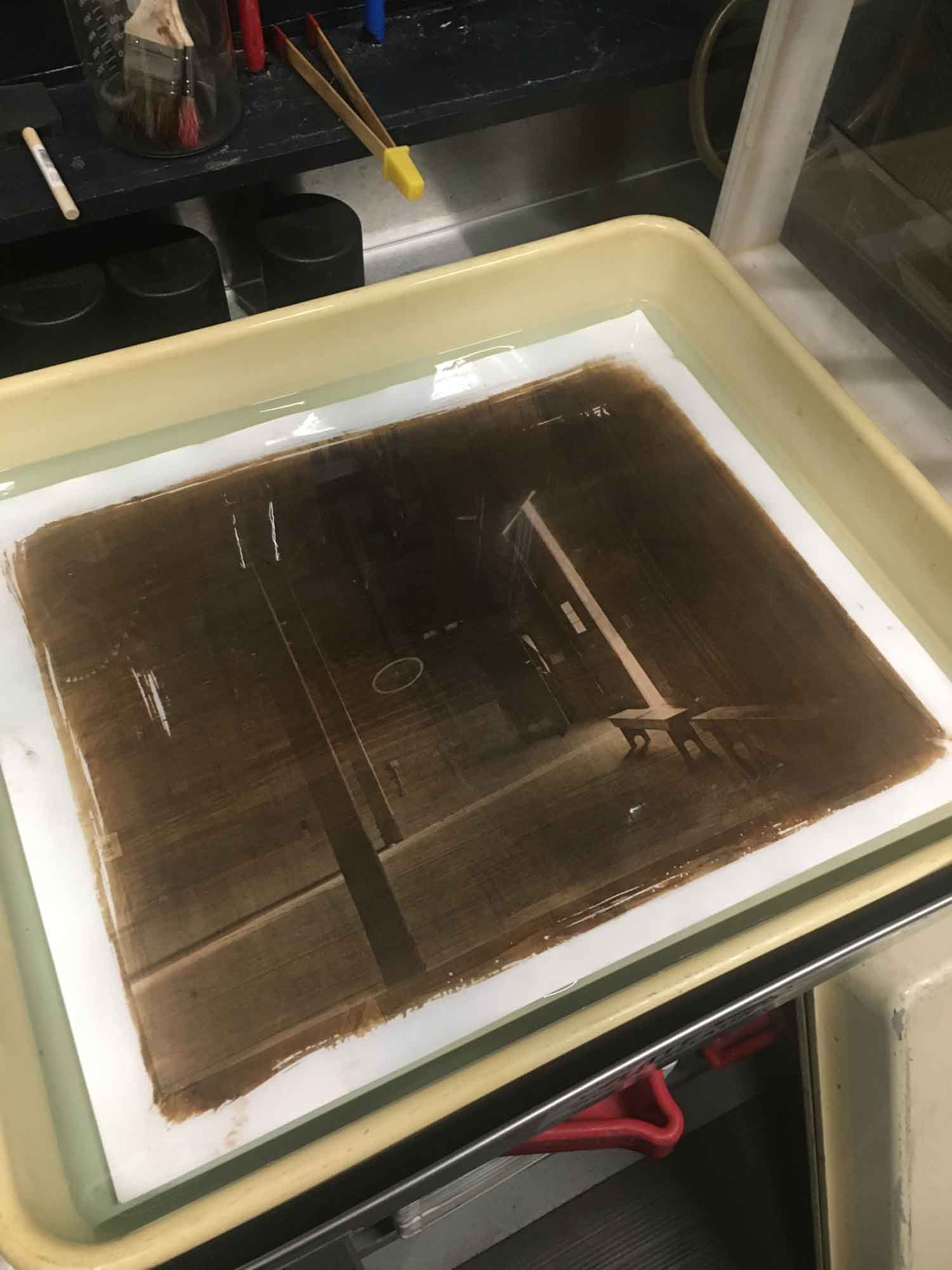 In my experience with Gallic acid developer, it gets mottled when too much silver nitrate is added. This was the final print after several hours of testing, so my guess is it might have happened in this print because the Gallic acid beaker got contaminated with silver due to me forgetting to wash the brush thoroughly. The earlier tests didn’t have that problem, so I’m hoping if I keep the Gallic acid clean I won’t have as much trouble. We’ll see if that’s the case when I run more tests later this week, but I ran out of ammonium bromide yesterday, so I’ll have to wait for that to arrive before I can keep testing