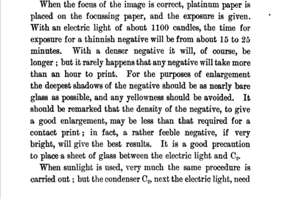 I've just checked Abney text, he says that with 2 condensers and 1100 candel carbon arc x2 enlargment of quarter plate exposure should be around 15-15 minutes.