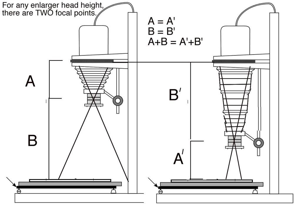 Can someone smart please explain to me the relationship between the bellows extension of an enlarger and the height needed to bring a negative into focus on the baseboard/easel, based on the focal length of an enlarging lens?