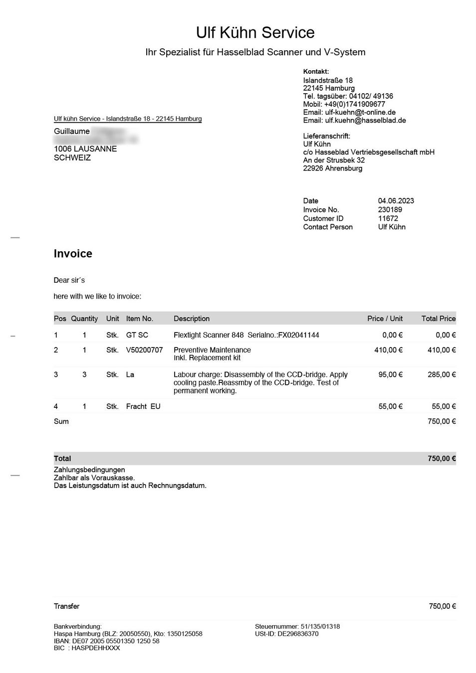 Good working condition. The scanner was serviced last year by Ulf Kühne in Germany (preventive maintenance + new CCD cooling paste, 750€ bill). The only issue is the feeding table lamp which is not working anymore (no more new units available)