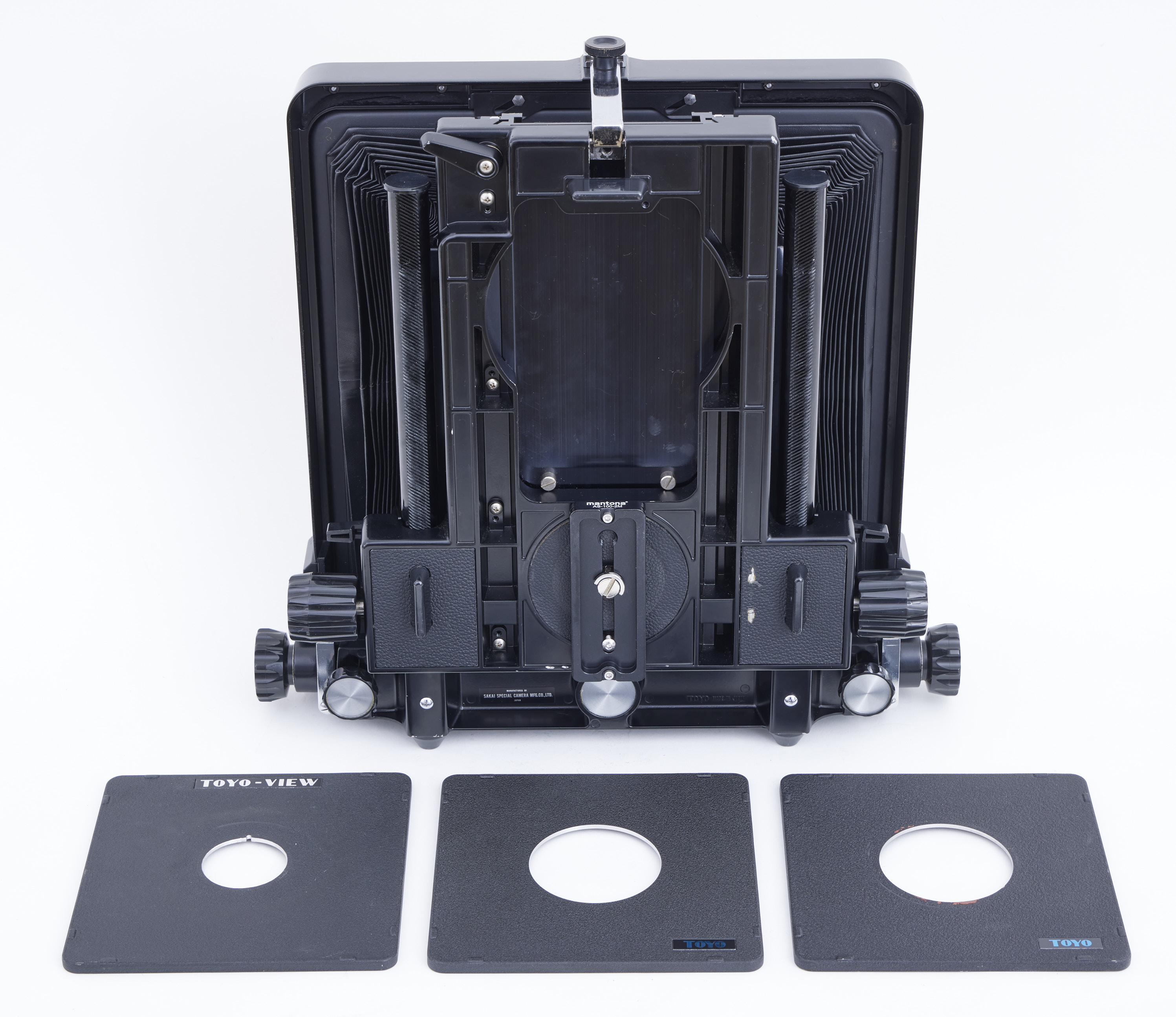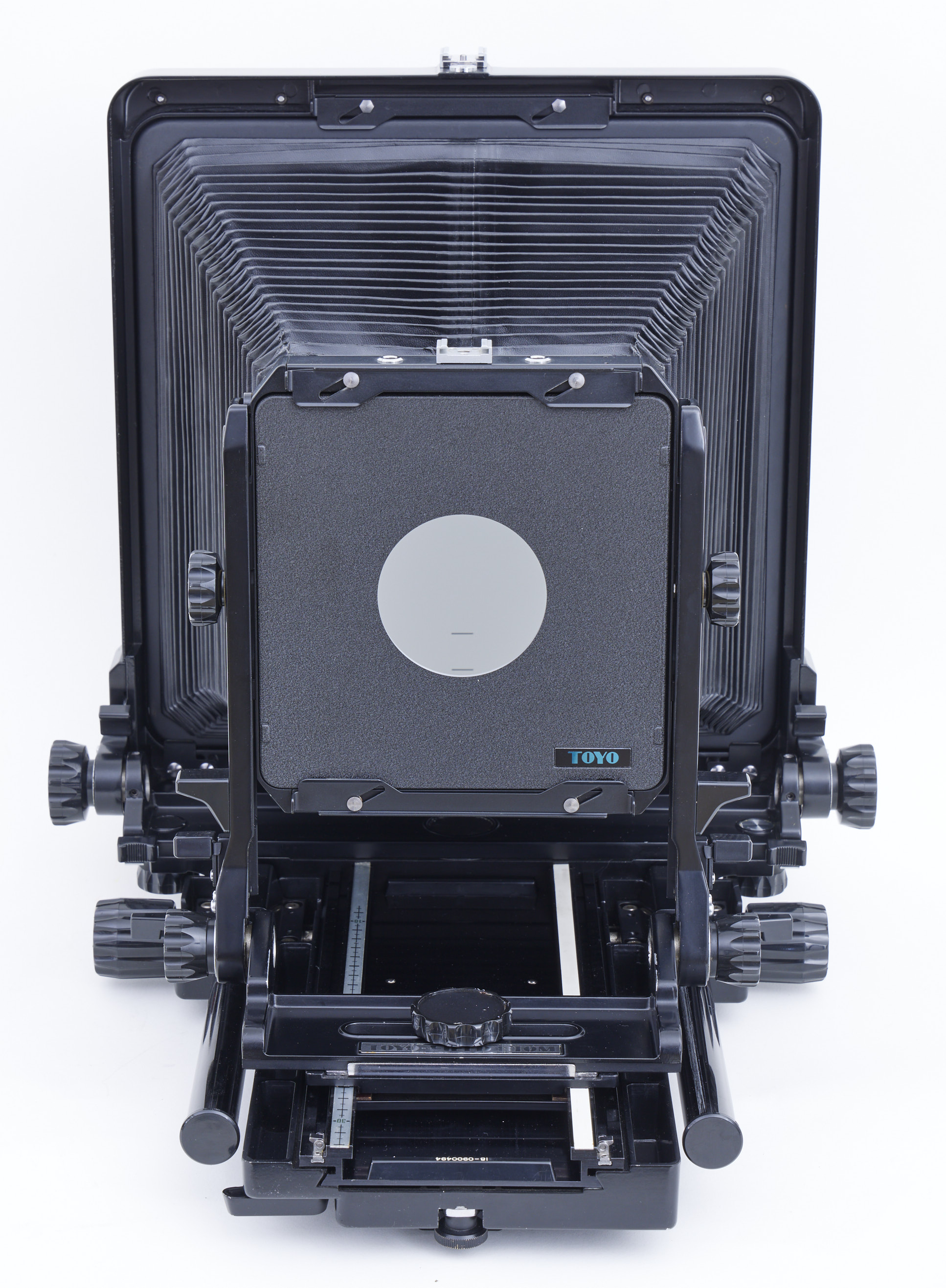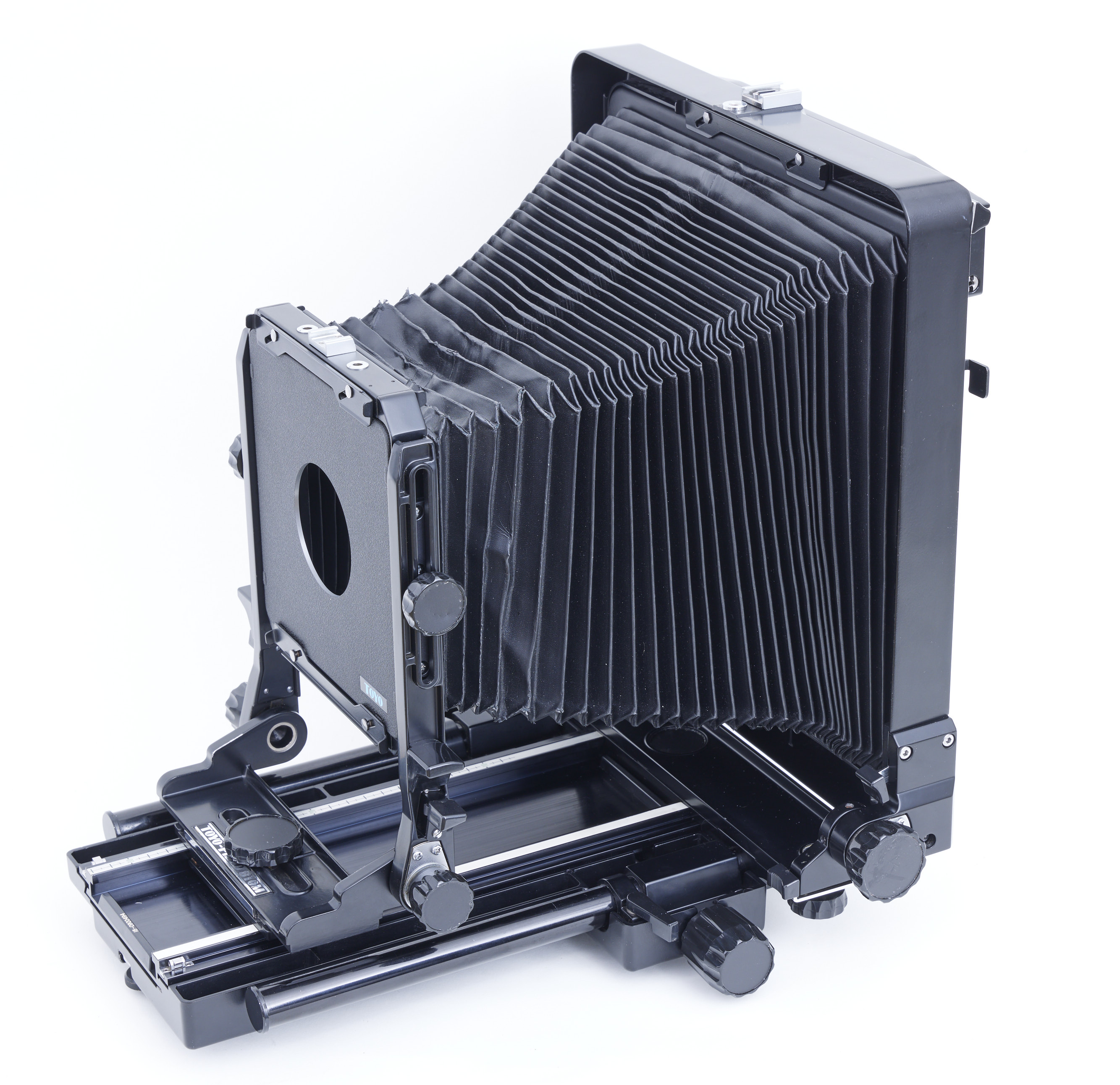 - Toyo 810M camera in good condition, (see photos). All movements are smooth and locking tight. Barely used (see photos). Just some folding wrinckles on the front of the bellow (still lightproof, no holes), and some scratches on the left rear body focusing bar (just cosmetic, no more debris to scratch).