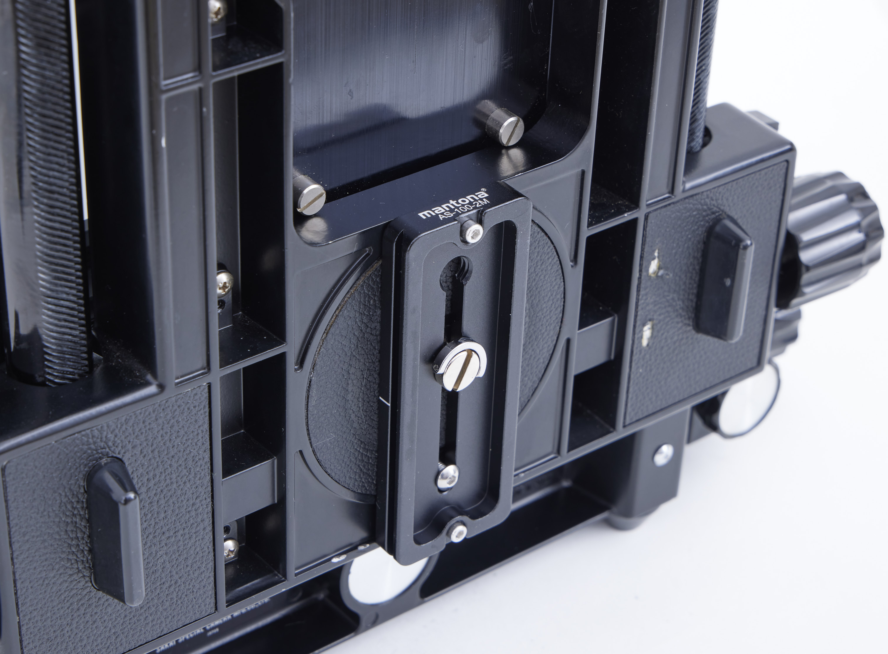 An arca swiss style classic 100mm plate is attached at the base of the camera.