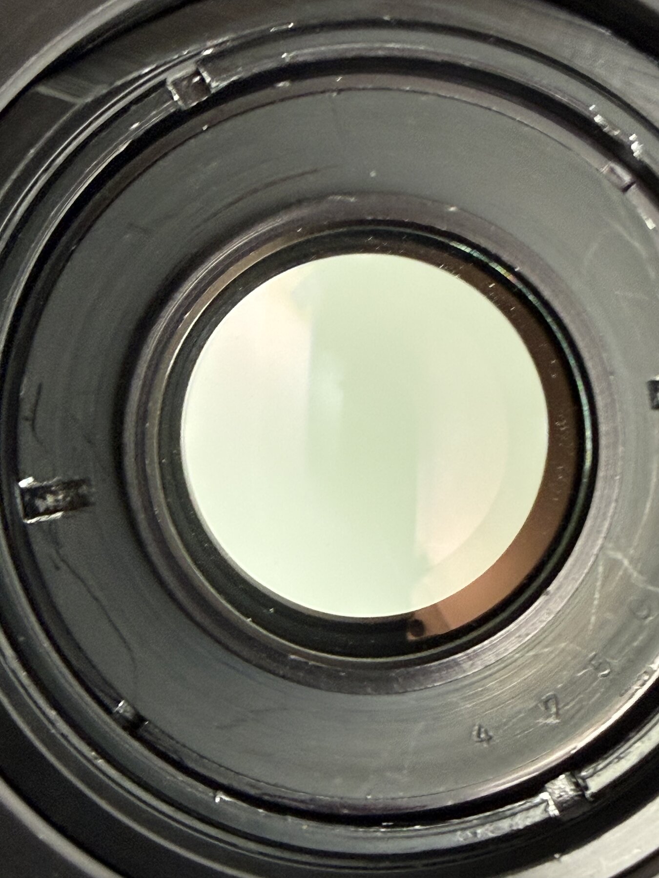 The Xenotar is in excellent optical condition with no scratches, marks, or fungus. It focuses smoothly, the aperture blades are clean and free of oil. The only defect that I can see with this lens is a very tiny amount of cosmetic wear on the outside of the filter ring. (You can see it most easily in the image to the right of the word "multicoating".) This wear does not impact the filter threads at all.