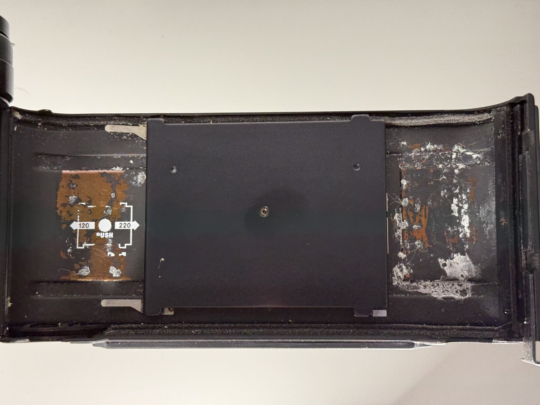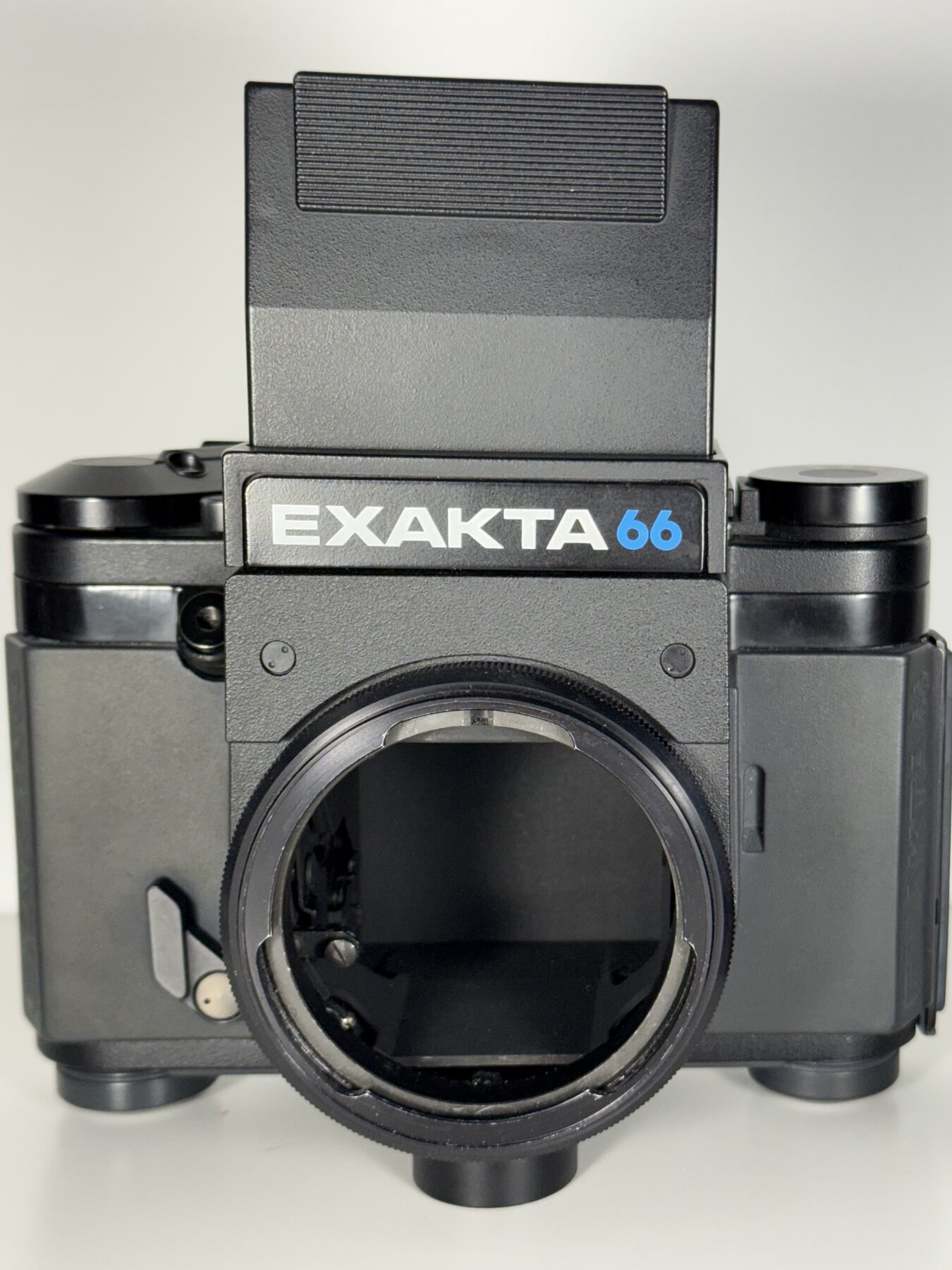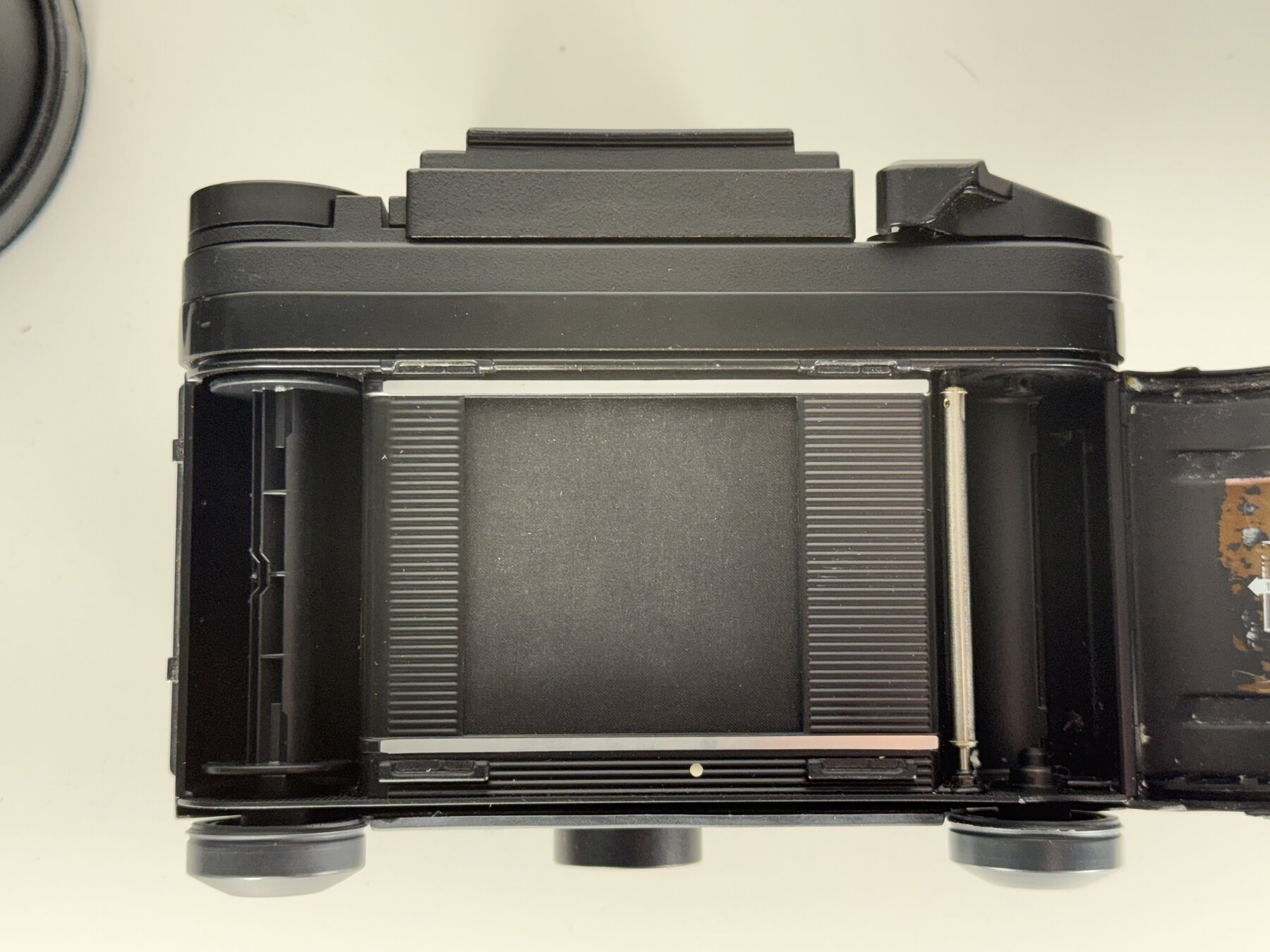 The Exakta 66 camera body is in good overall condition with one exception: the inside of the film door has a fair amount of scratching to the black paint that exposes the copper color underneath (please see the photo of the inside of the film door). This damage is purely cosmetic and has had absolutely no impact on any photo I have taken with this camera. I have no idea how it happened, since it was there when I purchased the camera. The shutter curtain is excellent with no pinholes or other problems. All functions on the body operate as they should without any issues.