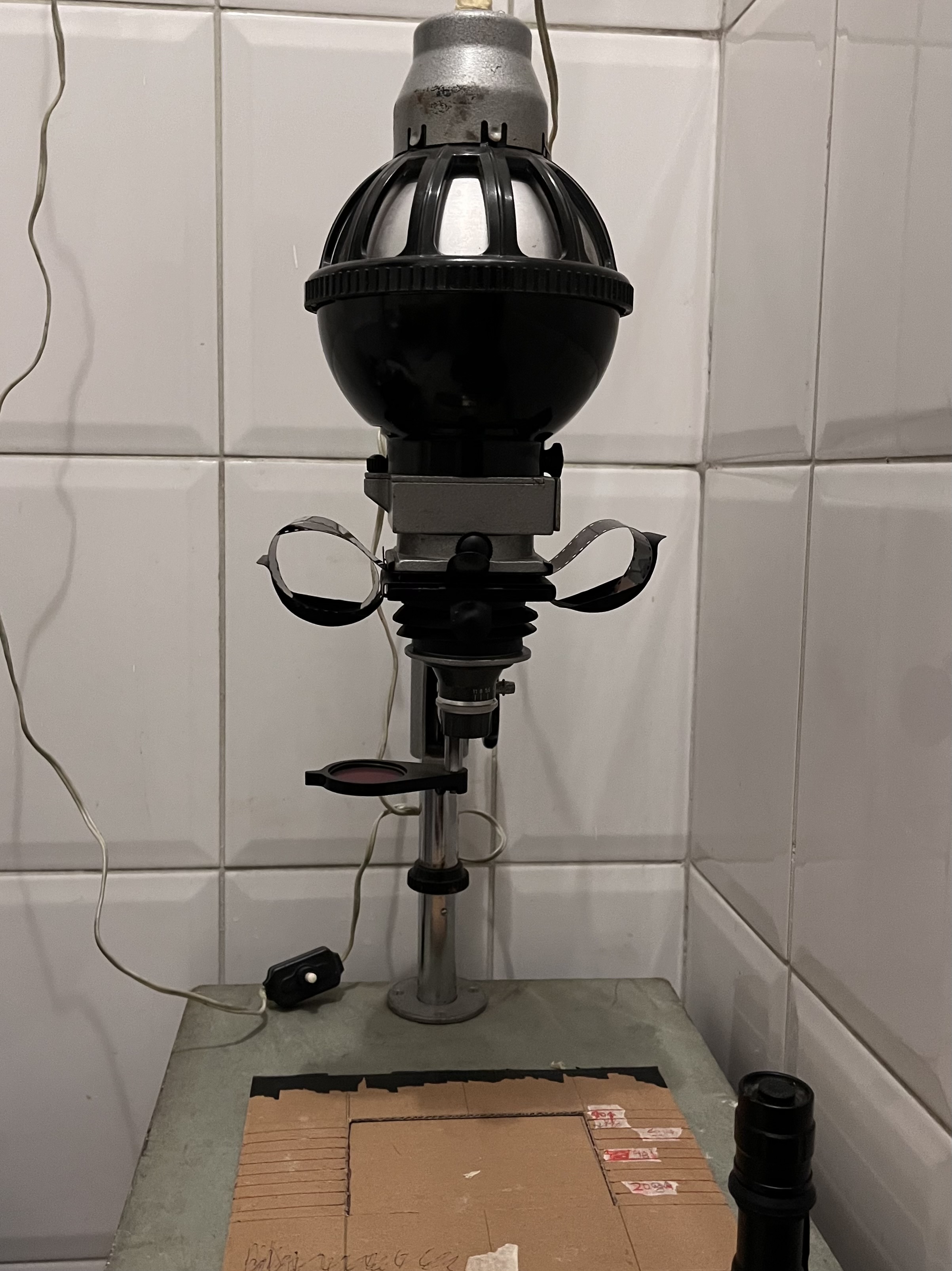Exposure: I reloaded a small clipping from the film into a spare canister (with remjet facing the lens) and shot a few frames using a Nikon F90x in broad-daylight at estimated ISO 6 (5 stops overexposure).