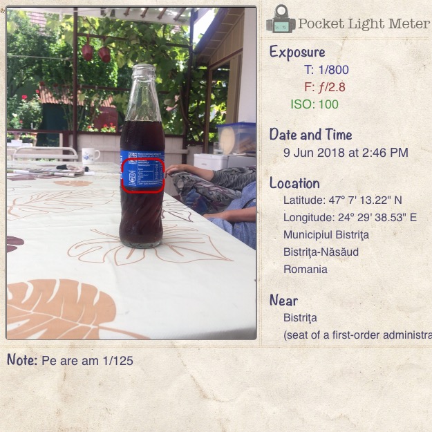 Now. I also downloaded an app for light metering (Pocket Light Meter), but it gives me different results than the in-camera meter. For example, I set the camera to ISO 100, f/2,8 and to expose I had to set the shutter speed to 1/125. The app light meter however was telling me to go to 1/800.