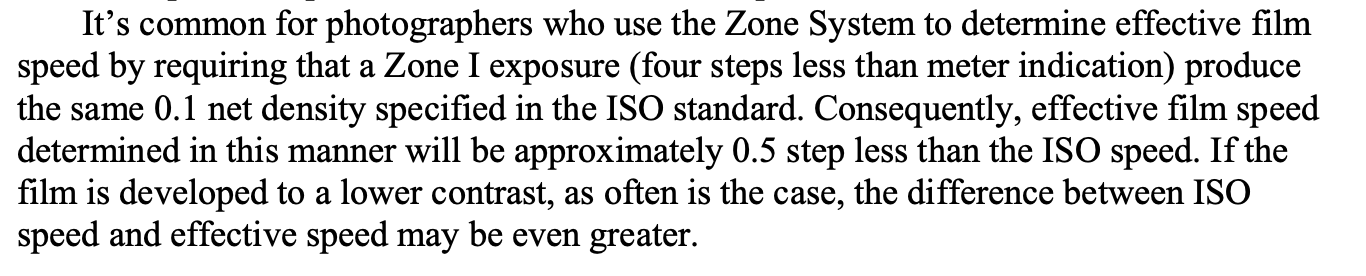 As for the Zone System, it was developed when the method of determining ASA speeds produced lower speeds. The four stop difference between the metered exposure and speed point with the Zone System produced equivalent speeds as the ASA speeds. They no longer agreed after the change of the 1960 standard while the Zone System methodlogy remained the same. The relationship between the shadow and metered exposure also changed. From C.N. Nelson's Safety Factors in Camera Exposure.