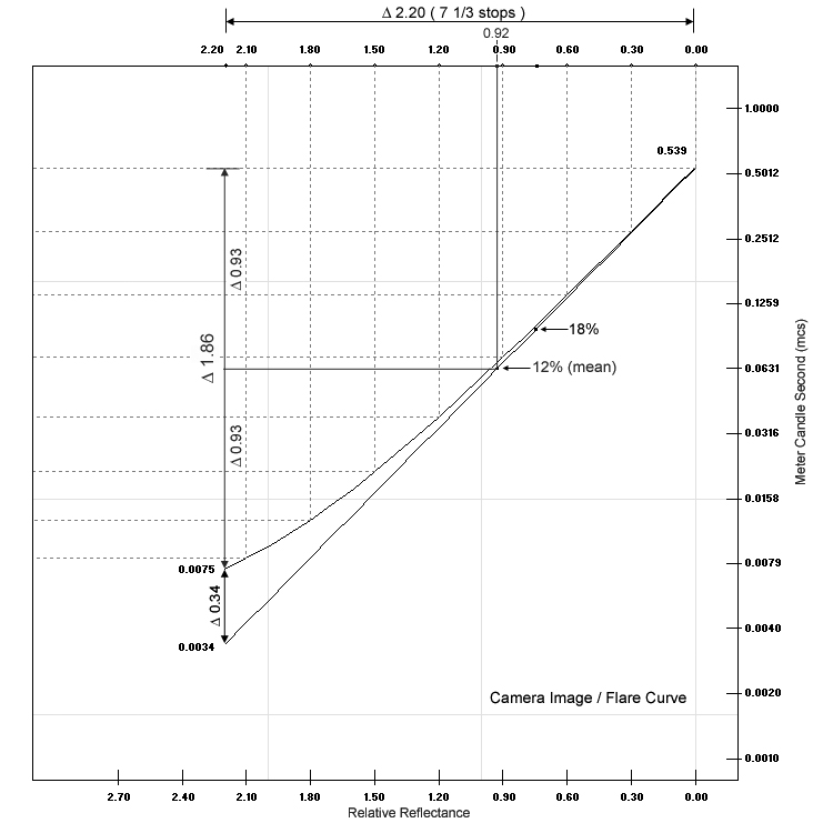 I agree for a statistically average scene, the mean reflectance is 8%. Jack Dunn uses 9% reflectance in his book Exposure Manual, most probably because he rounded the luminance range down to 7 stops. Eight percent reflectance can be considered the real world average reflectance. If this sounds fairly low for photography, it is, for contrary to what most people believe, the average reflectance for photography isn’t the mean of the values of the real world subject, but the mean of the values of the real world subject measured within the camera. From a photographic perspective, the mean of the camera image is the value that really matters, and the fundamental difference between the real world luminance range and the camera’s illuminance range is the camera image includes flare (Graph 1).