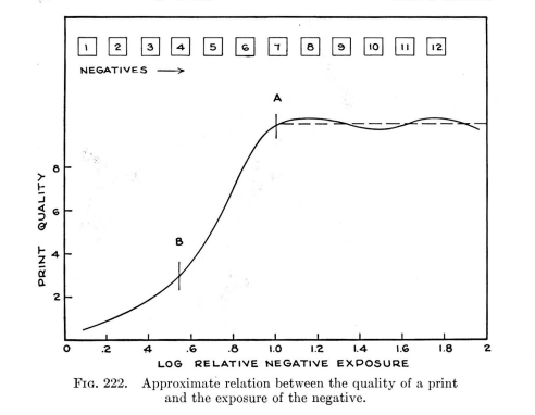 Fortunately, a nice summary is available in all the editions of Theory of the Photographic Process. From the 3th edition, page 440, "A statistical method was used by Jones to determine the relationship between the exposure of the negative and the quality of the resultant prints. A series of twelve negatives in which the camera exposure was increased progressively from a very low to a very high value was made on each material to be studied. To secure the best possible print from each negative thus obtained, skilled operators were asked to print each negative on several grades of paper, use several printing exposures, quality of the resultant prints. A series of twelve negatives in which the camera exposure was increased progressively from a very low to a very high value was made on each material to be studied. To secure the best possible print from each negative thus obtained, skilled operators were asked to print each negative on several grades of paper, use several printing exposures, and then select from this group of prints the best one that each negative was capable of giving. These series of prints were then arranged in order and were judged by two hundred observers, each observer being requested to pick the first print in each series which he considered “excellent”. This is, of course, a very laborious method of working, but it allowed a statistical selection of the negative which the average observer would consider “satisfactory.” It was also possible to select a print inferior to the “first-excellent” print."