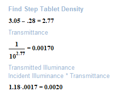 Thanks.........my Stouffer calibrated step #21 is 3.03, and I was mistaken on the log E .28, it's actually .32 for a step density of 2.71 and transmittance of 0.0019