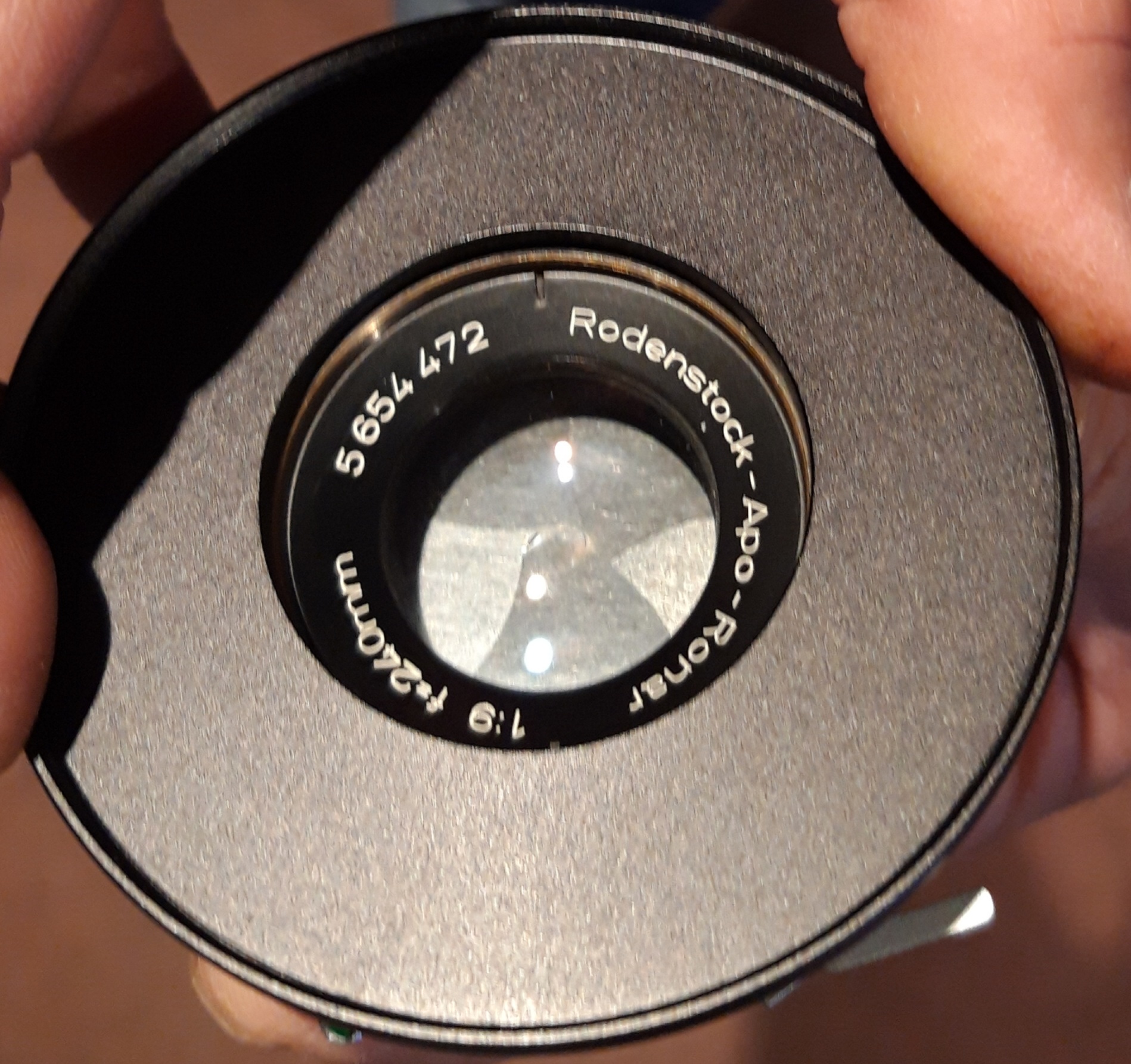 I just bought a lens Rodenstock Apo Ronar 240mm, f9. Old version, corrected for short distance photos.