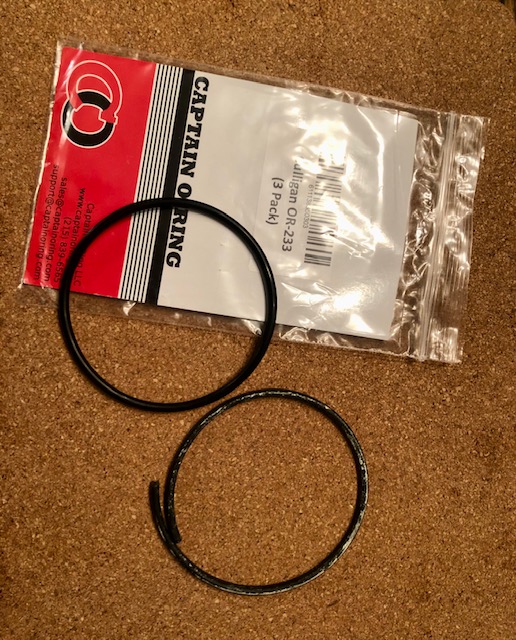 I went to a big plumbing supply store with the measurements for the gasket, parts department specialist gave me something way too big. Found the right thing from "Captain O-Ring", if you can imagine. Fit right on and the cylinder squeaked over it very satisfyingly.