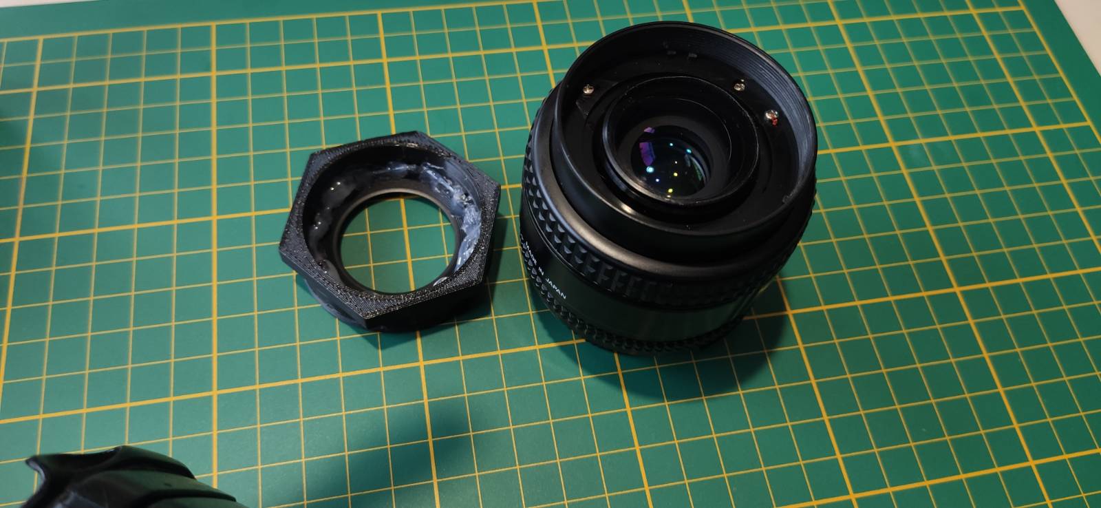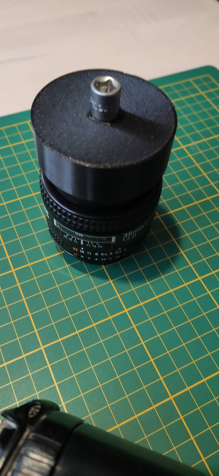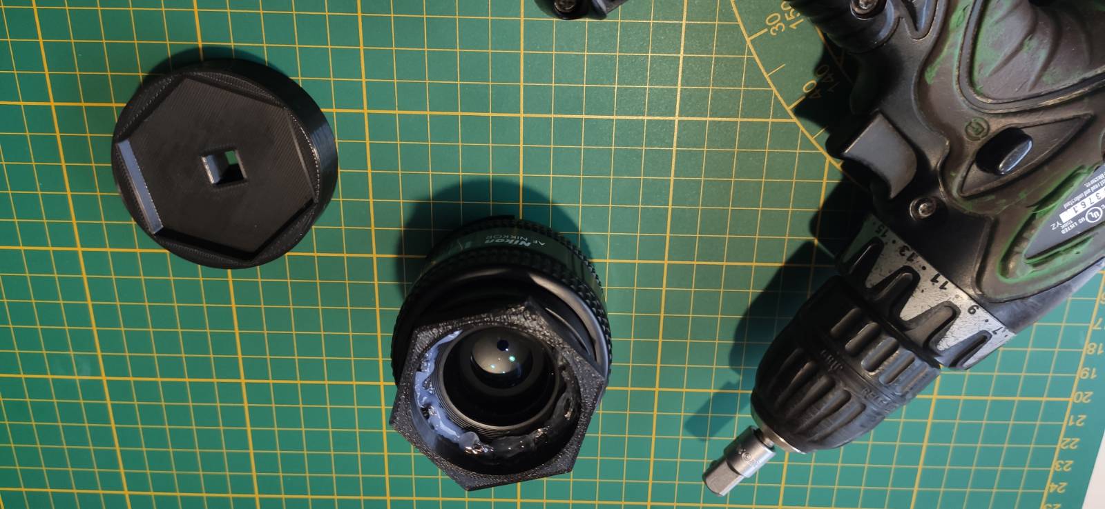 Now the ring was straight but I still wasn’t able to unscrew it. I really didn’t want to damage the ring or lens, so I came up with an idea for another tool. This time it consisted of two parts: one that I glued to the ring using hot glue, and another that served as an adapter for a cordless drill.